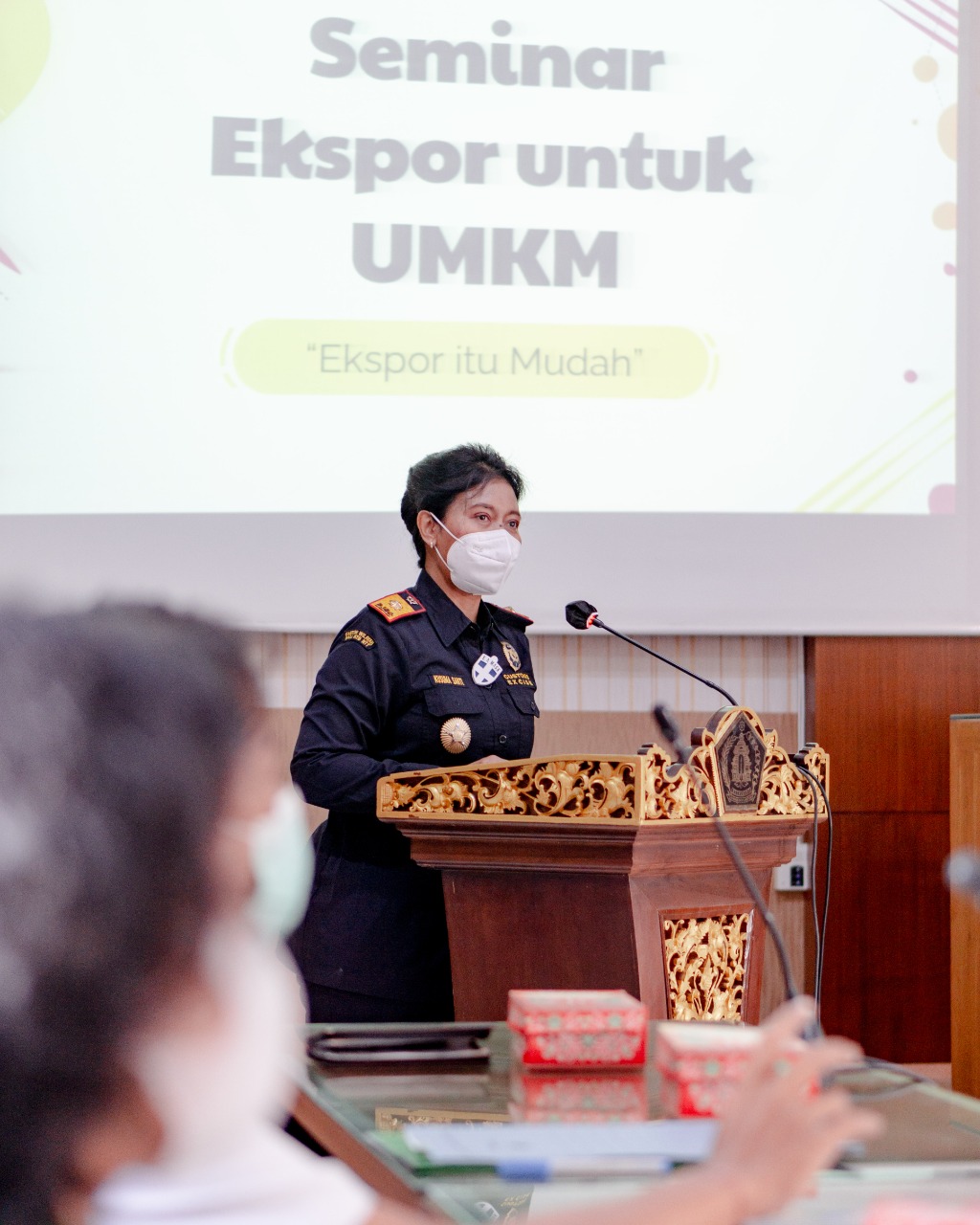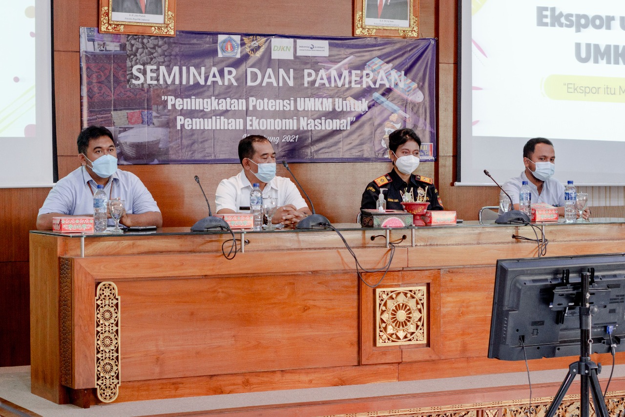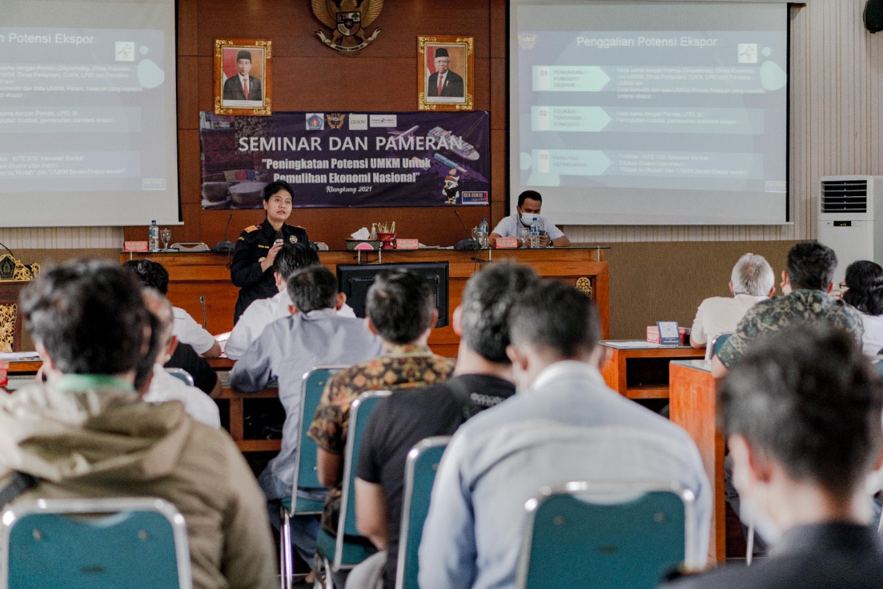 Denpasar – Komitmen Kementerian Keuangan dalam program Pemulihan Ekonomi Nasional (PEN) di wilayah Provinsi Bali salah satunya diwujudkan dengan kegiatan penggalian potensi Usaha Mikro Kecil Menengah (UMKM) di Kabupaten Klungkung. Kegiatan tersebut diwujudkan melalui Seminar Ekspor Untuk UMKM dengan Tema : “Pemulihan Potensi UMKM untuk Pemulihan Ekonomi Nasional” di Aula Kantor Pemerintah Kabupaten Klungkung pada Rabu (26/06). “Kegiatan ini dapat menjadi sarana menggali ilmu ekspor dalam rangka meningkatkan kegiatan perekonomian Kabupaten Klungkung.” terang Kepala Kantor Pelayanan Bea Cukai (KPBC) Denpasar Kusuma Santi.
