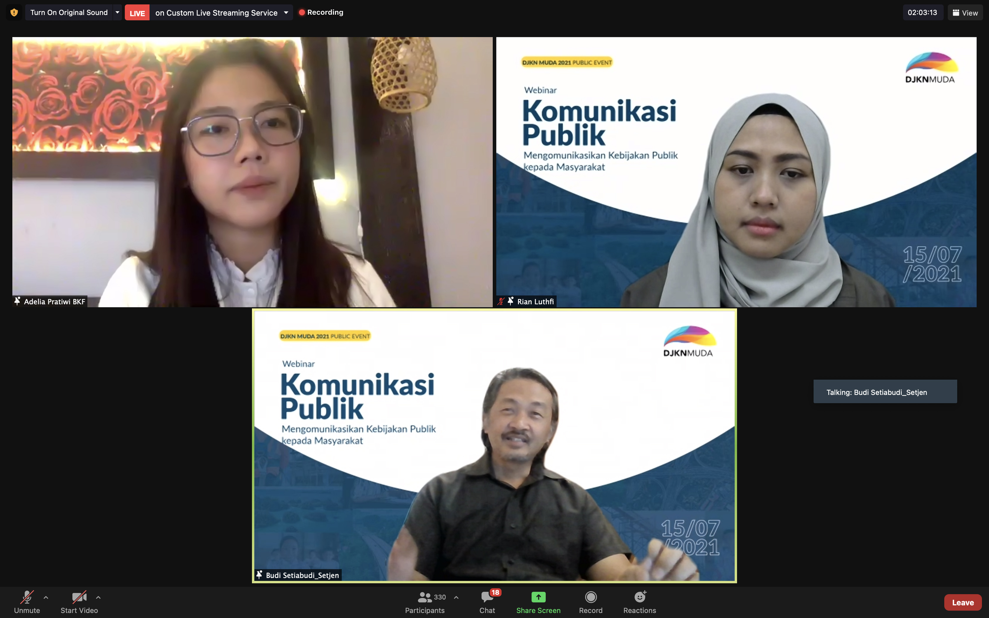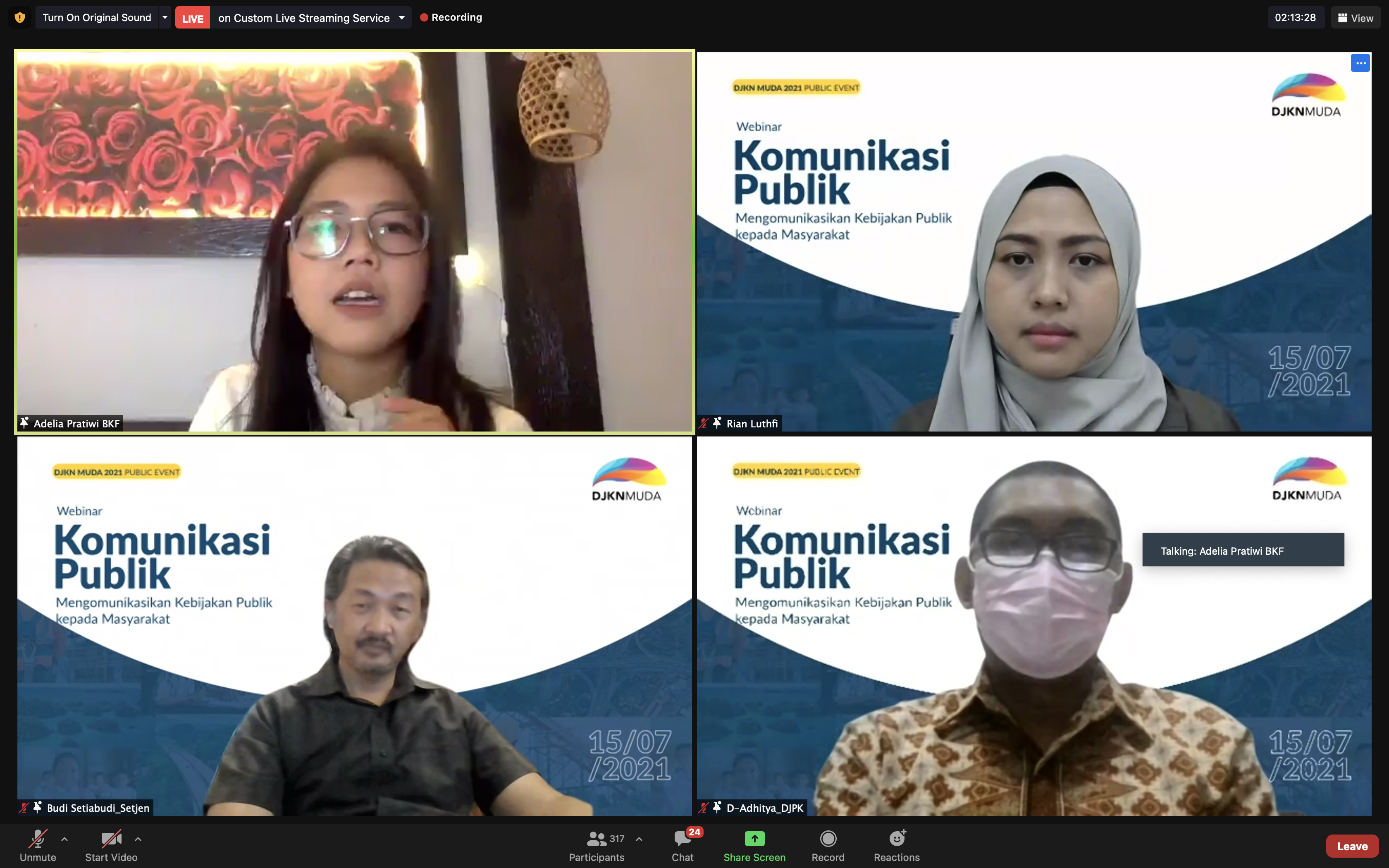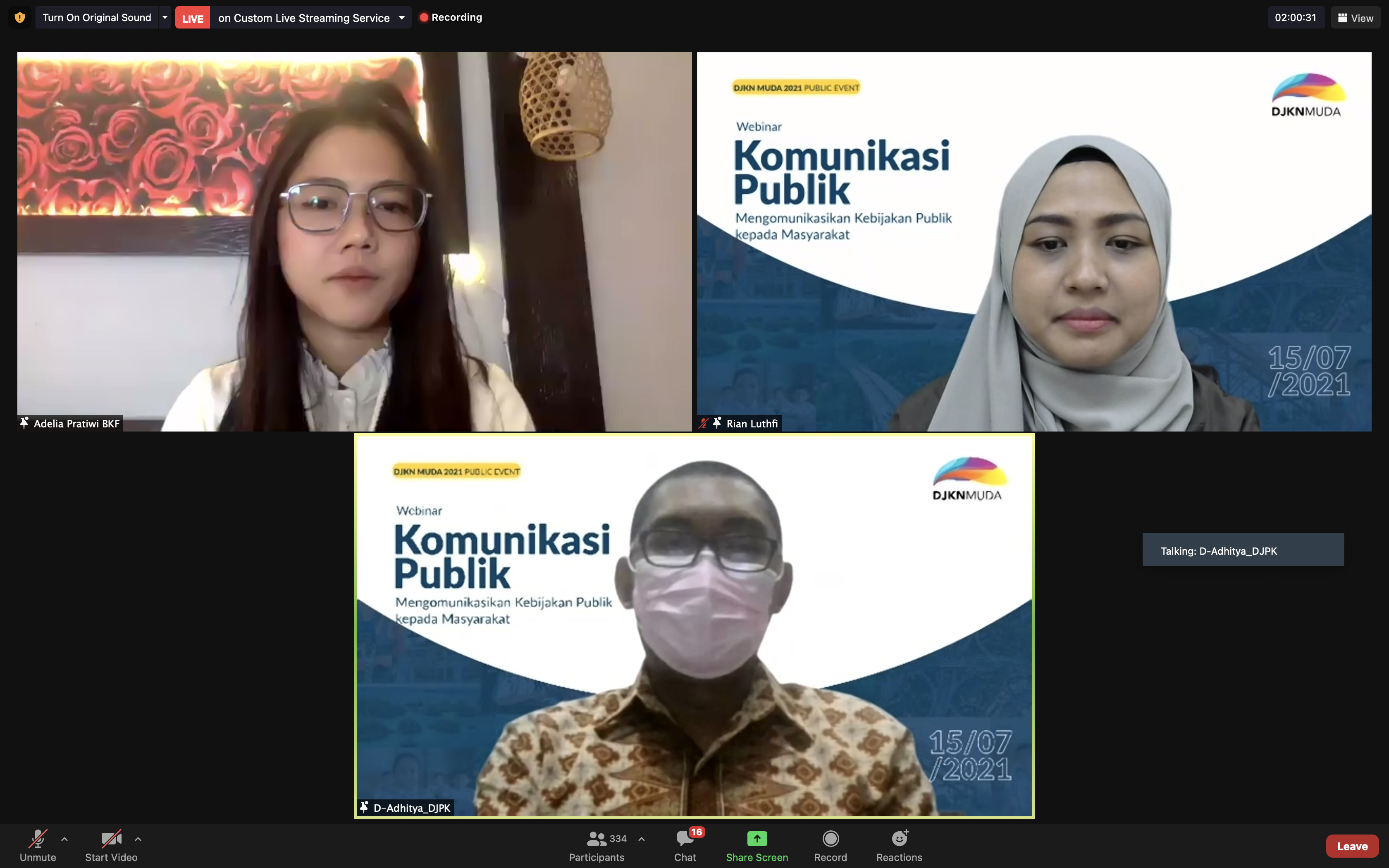 Dalam kegiatan yang diinisiasi oleh DJKN Muda tersebut menghadirkan Kepala Subbagian Strategi dan Manajemen Komunikasi Publik Badan Kebijakan Fiskal (BKF) Adelia Surya Pratiwi sebagai narasumber. Ia mengatakan bahwa dalam menyusun komunikasi publik perlu dilibatkan seluruh unit yang menangani kebijakan tersebut. Hal tersebut bertujuan agar tim komunikasi dapat memiliki sudut pandang dan pemahaman yang sama dengan tim substansi yang merumuskan kebijakan sehingga ketika melakukan komunikasi publik dapat dengan mudah diterima oleh masyarakat.