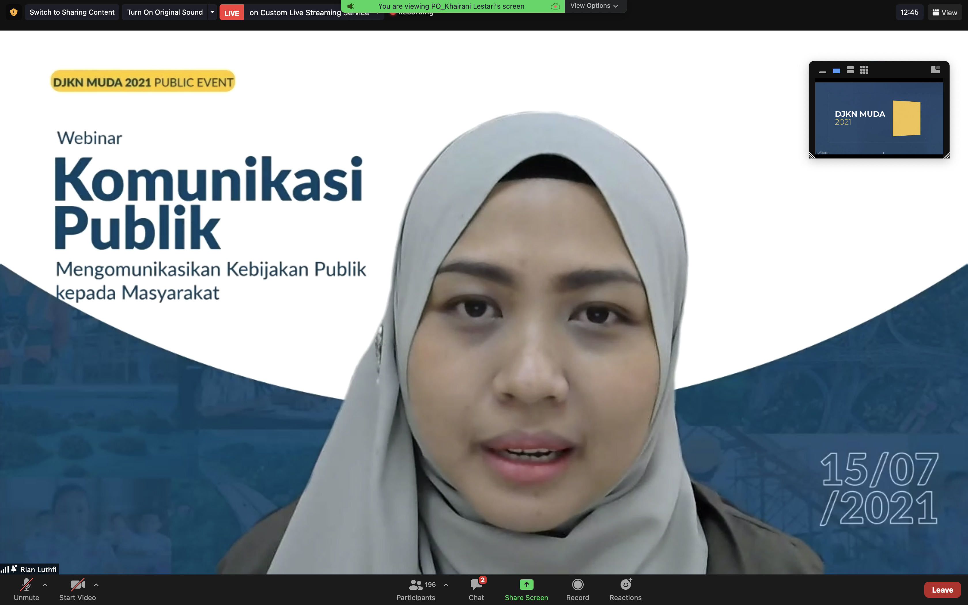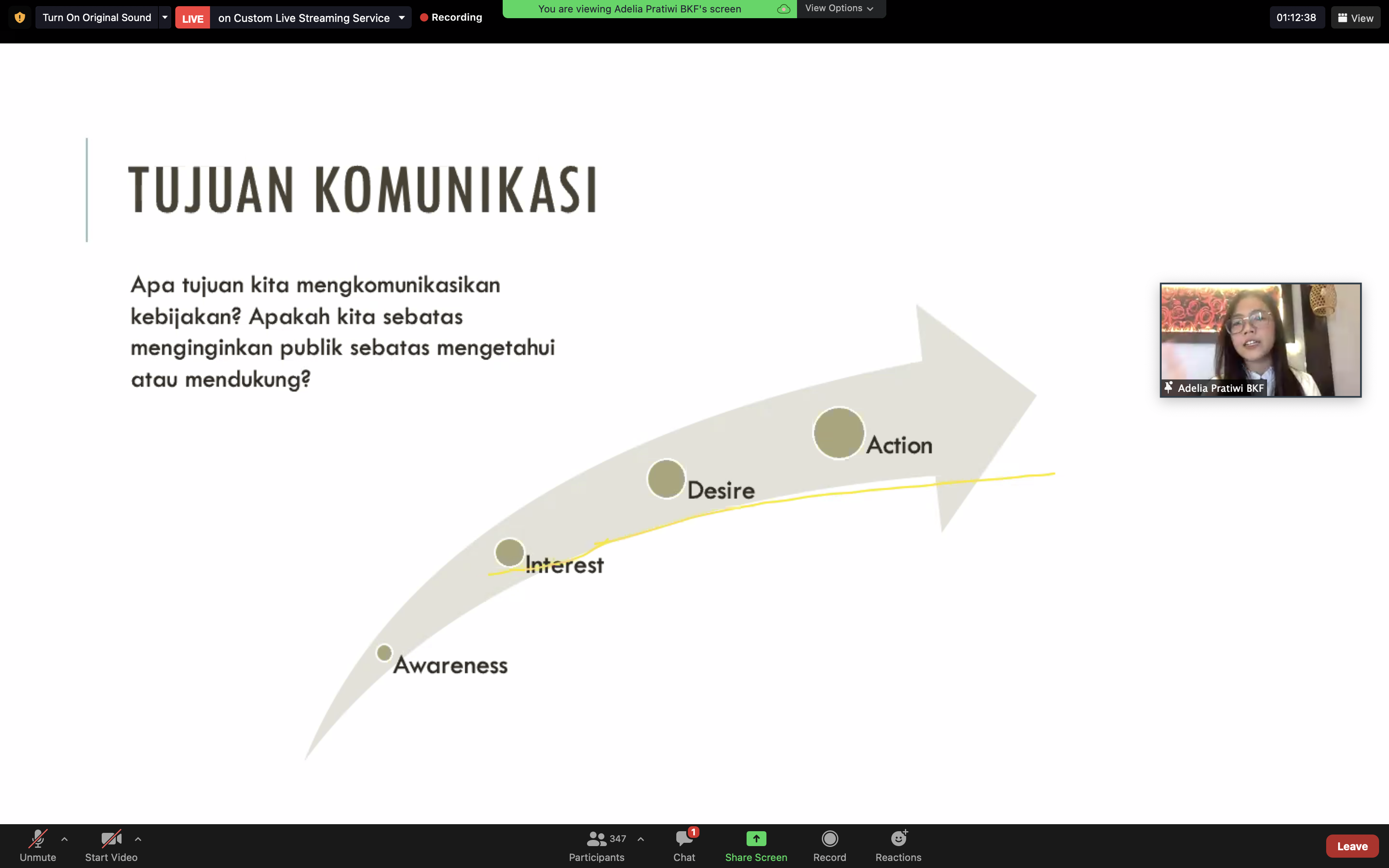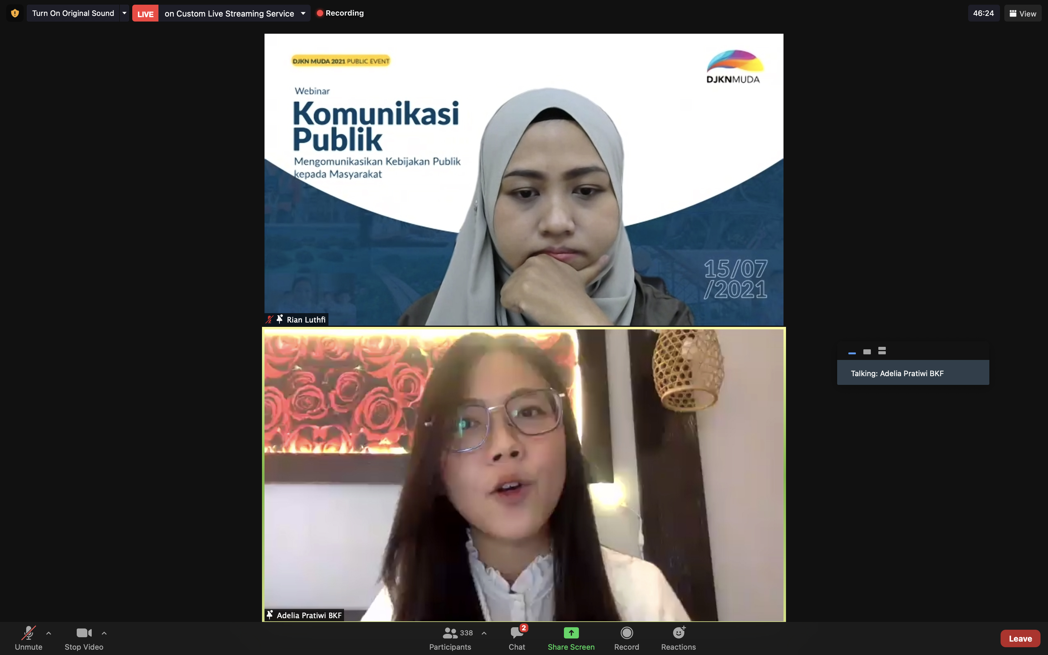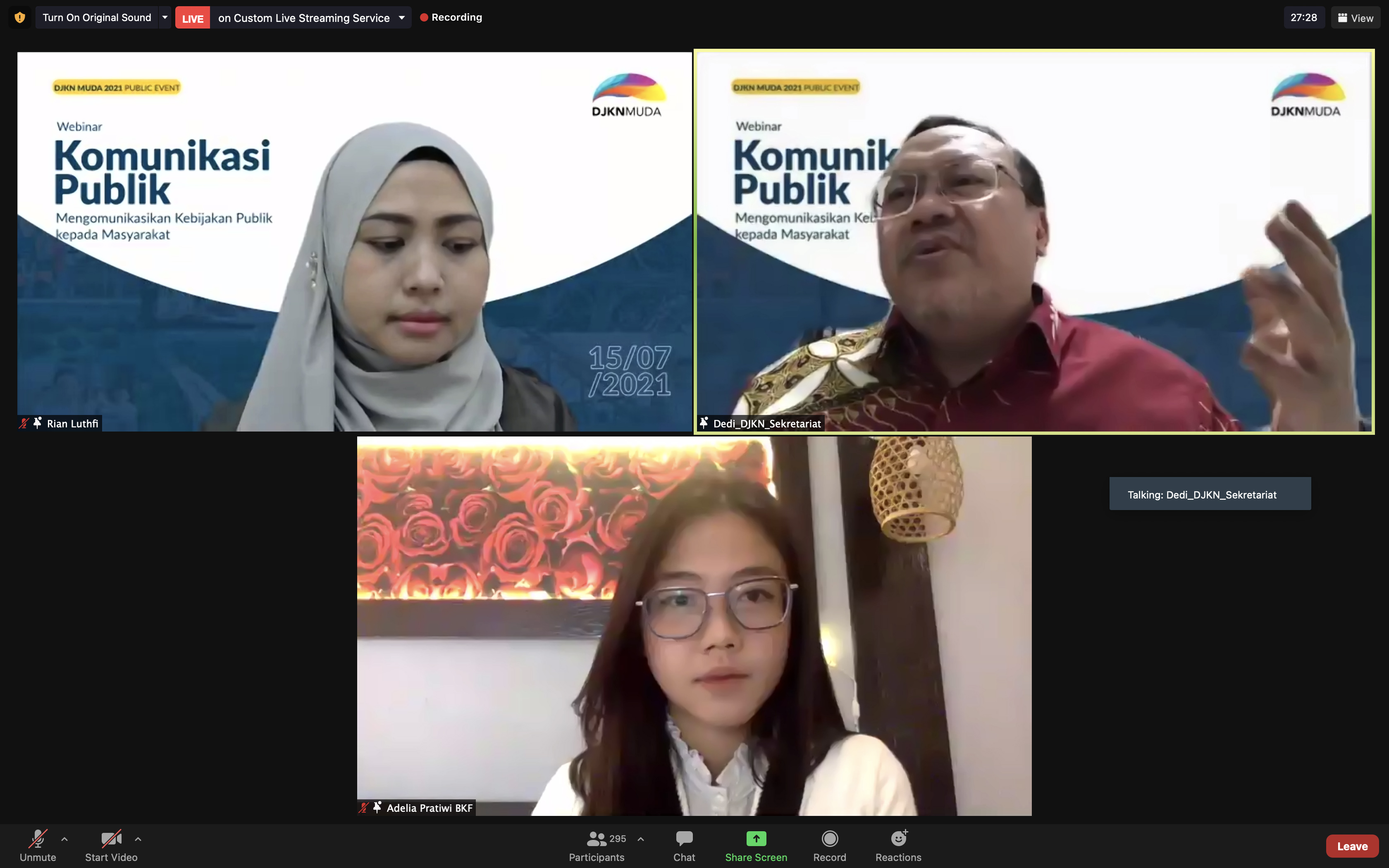 Dalam kegiatan yang diinisiasi oleh DJKN Muda tersebut menghadirkan Kepala Subbagian Strategi dan Manajemen Komunikasi Publik Badan Kebijakan Fiskal (BKF) Adelia Surya Pratiwi sebagai narasumber. Ia mengatakan bahwa dalam menyusun komunikasi publik perlu dilibatkan seluruh unit yang menangani kebijakan tersebut. Hal tersebut bertujuan agar tim komunikasi dapat memiliki sudut pandang dan pemahaman yang sama dengan tim substansi yang merumuskan kebijakan sehingga ketika melakukan komunikasi publik dapat dengan mudah diterima oleh masyarakat.