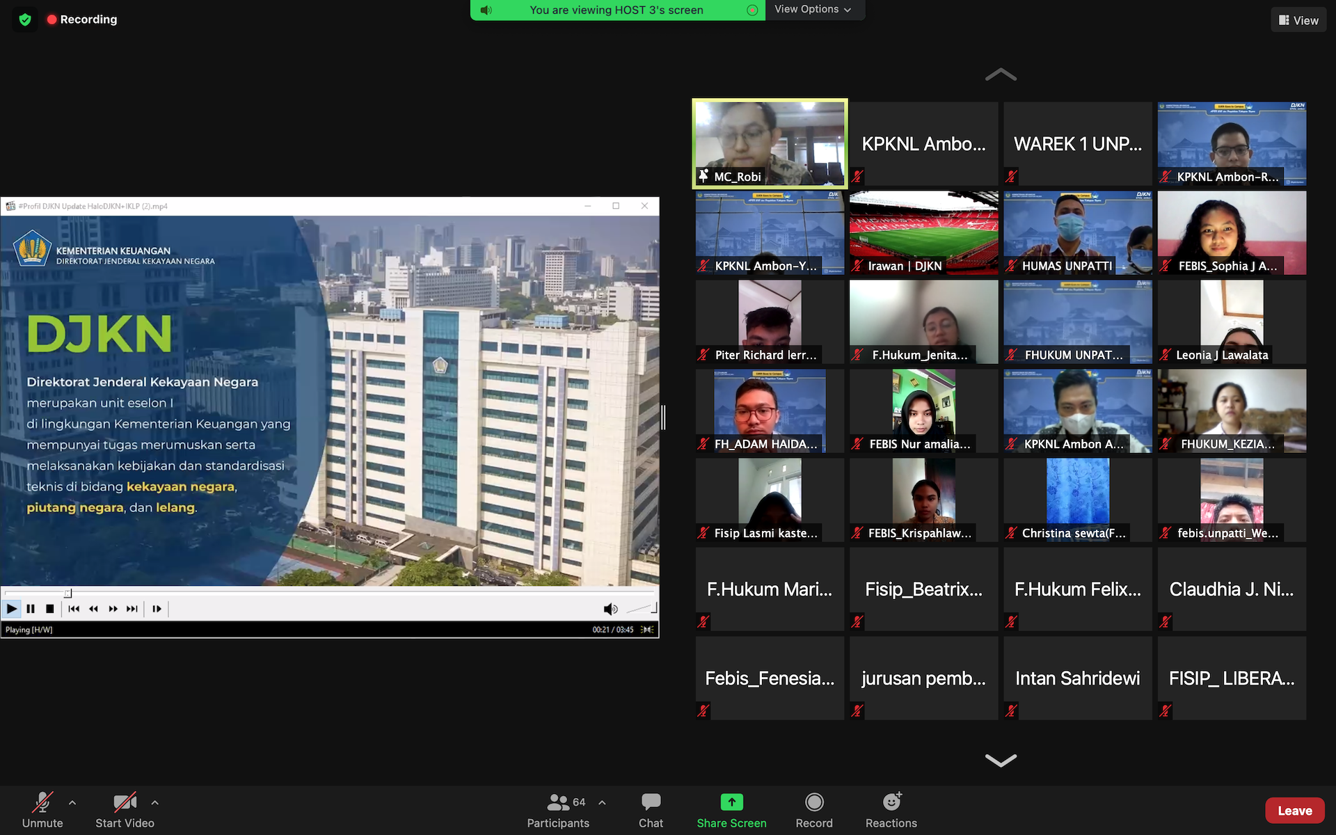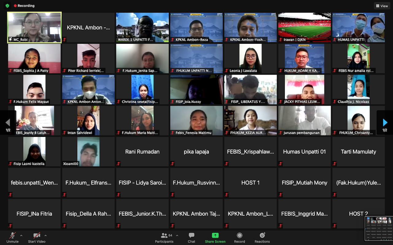 Dengan konsep dan tema yang sukses dieksekusi melalui media daring Zoom Meeting, KPKNL Ambon menghadirkan pembicara yang memiliki kapasitas dan spesialisasi terkhusus pada bidangnya masing-masing. Adapun Pengisi acara tersebut diantaranya adalah, Kepala KPKNL Ambon, Yoshua Wisnungkara yang pada kesempatan tersebut memberikan opening speech; Wakil Rektor Bidang Akademik Universitas Pattimura, Prof. DR. Fredy Leiwakabessy, M.Pd turut hadir memberikan sambutan; Kepala Seksi Pengelolaan Kekayaan Negara (Kasi PKN) Anton Wijaya sebagai Narasumber 1, Kepala Seksi Piutang Negara (Kasi PN) KPKNL Ambon, Reza Mirwanda sebagai Narasumber 2; dan Pelaksana pada Seksi Lelang KPKNL Ambon, Robi Suwarna sebagai Master of Ceremony (MC).