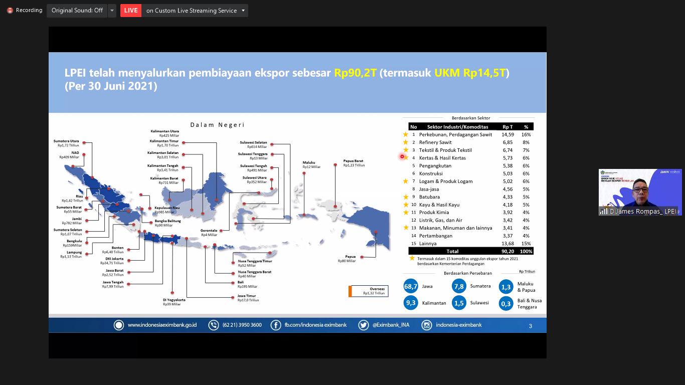 hingga 30 Juni 2021, LPEI telah menyalurkan pembiayaan ekspor sebesar Rp90,2 triliun