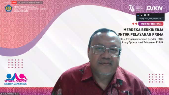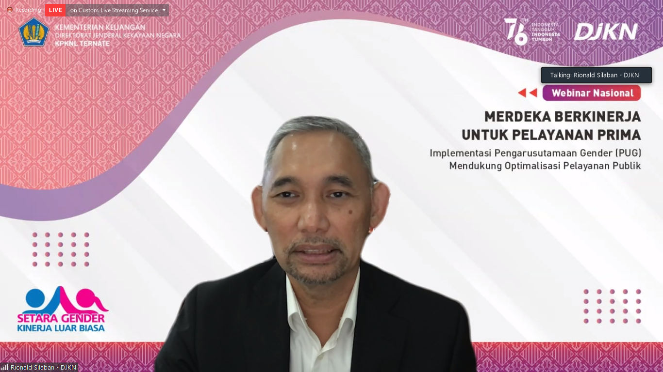 Ternate – Implementasi Pengarusutamaan Gender (PUG) adalah strategi pembangunan untuk mencapai keadilan dan kesetaraan, dengan disertakannya perspektif gender dalam setiap langkah penyusunan kebijakan. Implementasi PUG bukan sekedar program sembari lalu. Hal ini disampaikan oleh Direktur Jenderal Kekayaan Negara, Rionald Silaban saat memberikan keynote speech sekaligus membuka acara Webinar Nasional, Merdeka Berkinerja untuk Pelayanan Prima yang diselenggarakan secara daring oleh Kantor Pelayanan Kekayaan Negara dan Lelang (KPKNL) Ternate pada Selasa (24/8).
