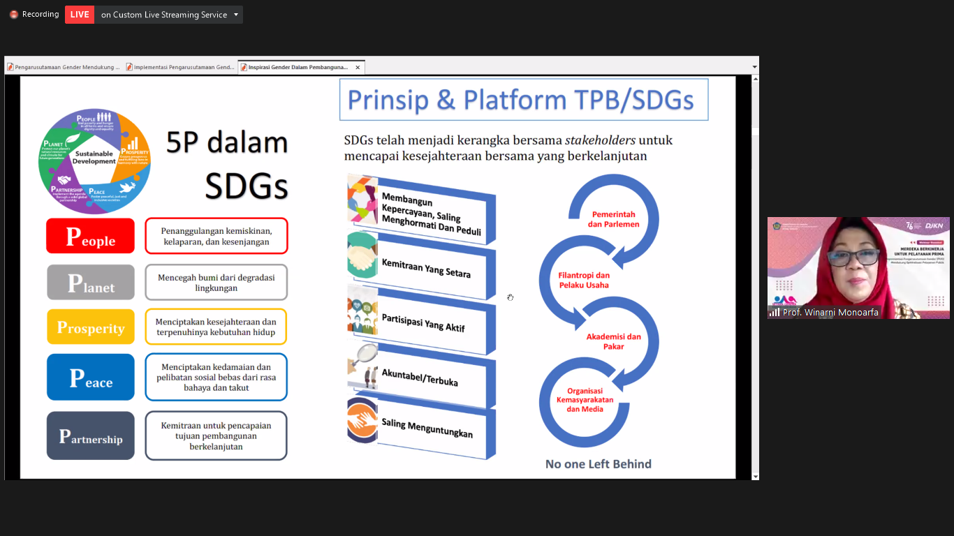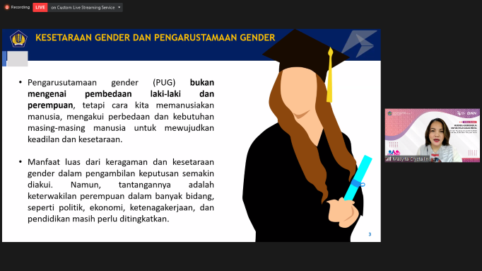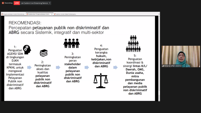Webinar dengan tema Implementasi PUG Mendukung Optimalisasi Pelayanan Publik tersebut menghadirkan tiga narasumber yang berpengalaman dalam bidang pengarusutamaan gender, yaitu Staf Khusus Menteri Keuangan Bidang Perumusan Kebijakan Fiskal dan Makroekonomi Masyita Crystalin, Komisioner pada Komisi Nasional Perempuan Maria Ulfah Anshor, dan Staf Ahli Menteri Bidang Energi Kementerian Lingkungan Hidup dan Kehutanan Winarni Dien Monoarfa.