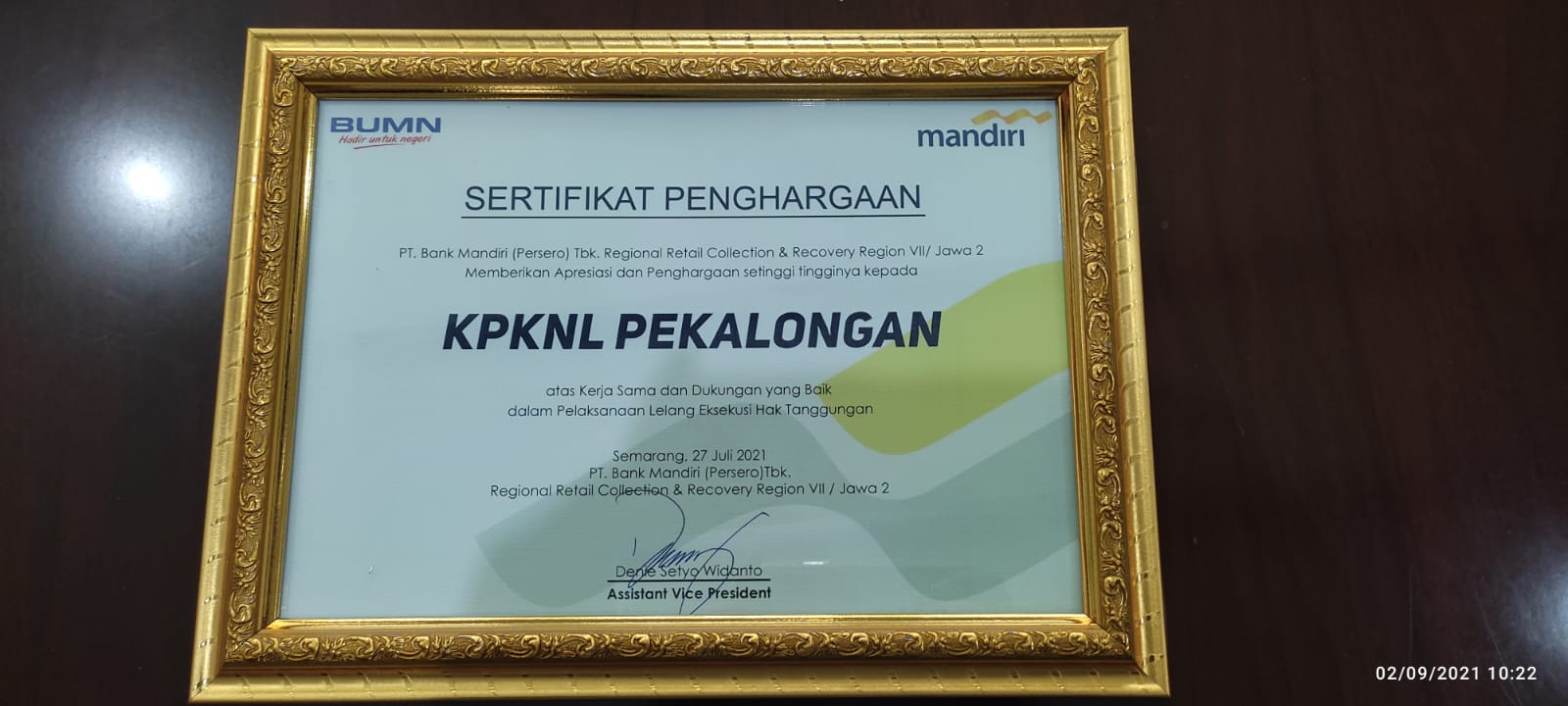 Kekayaan Negara dan Lelang (KPKNL) Pekalongan mendapatkan penghargaan dari PT
