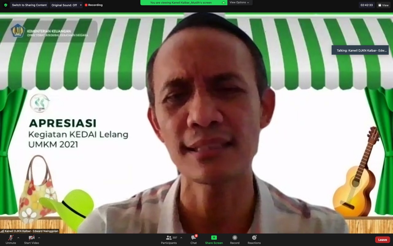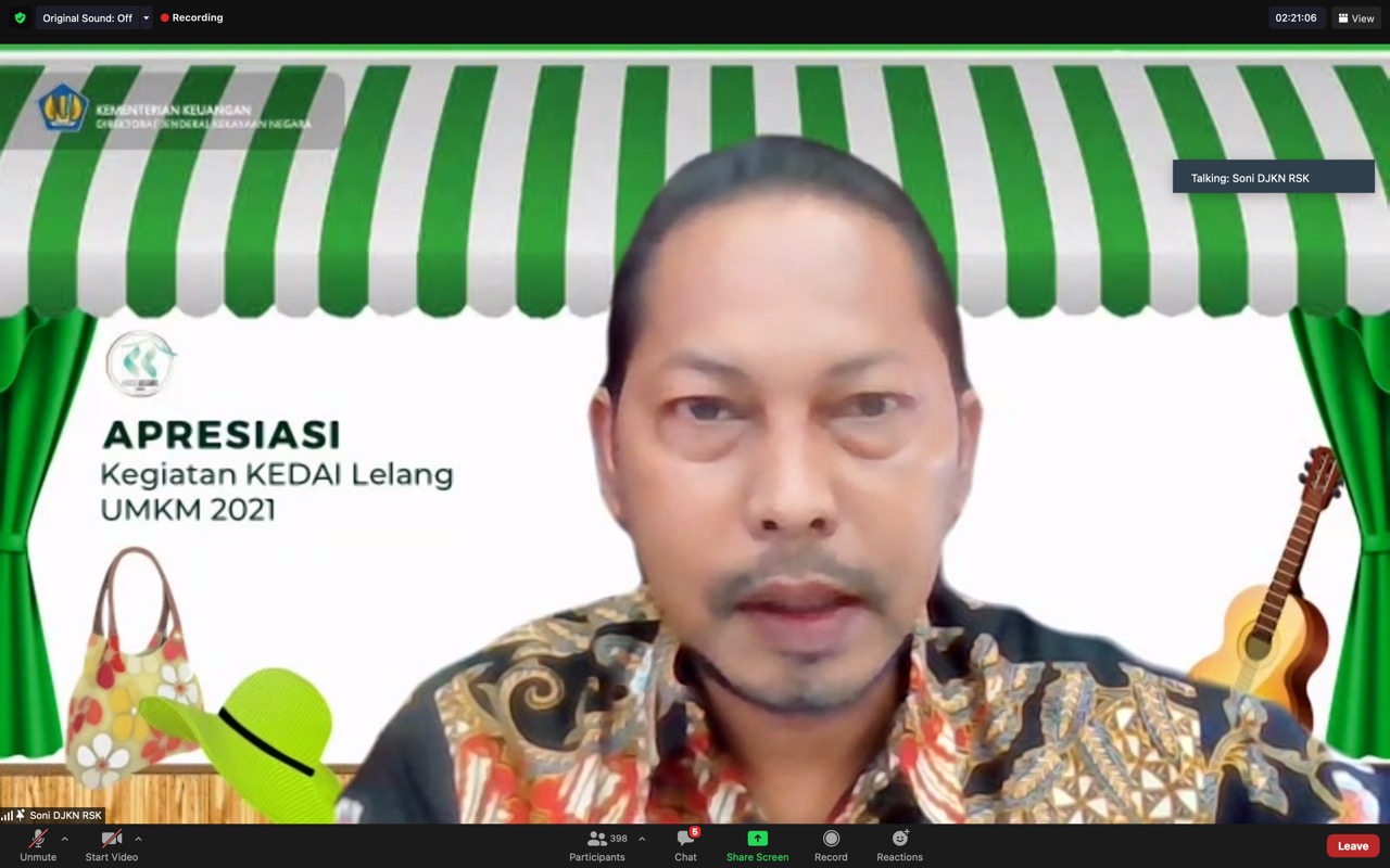 Jakarta – Sekretaris Direktorat Jenderal Kekayaan Negara (Sesditjen KN) Dedi Syarif Usman memberikan apresiasi atas terlaksananya program Kompetisi dan Inovasi Lelang Sukarela Produk Usaha Mikro, Kecil dan Menengah (Kedai Lelang UMKM) yang diinisiasi oleh Direktorat Lelang Direktorat Jenderal Kekayaan Negara (DJKN). Menurutnya, adanya program Kedai Lelang UMKM ini dapat memberikan lebih banyak opsi kepada masyarakat dalam melakukan transaksi produk UMKM. “Kedai Lelang UMKM ini akan memberi warna baru di masyarakat bahwa belanja produk UMKM tidak hanya melalui marketplace tapi bisa melalui Kedai Lelang UMKM dengan segala nilai tambah yang diberikan,” terangnya dalam acara Apresiasi Kegiatan Kedai Lelang UMKM 2021 yang diselenggarakan pada Kamis (16/09) secara daring melalui aplikasi konferensi video.
