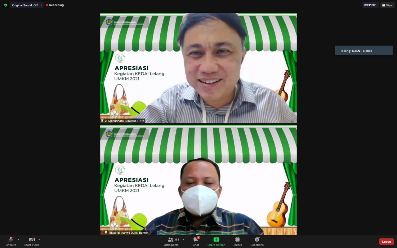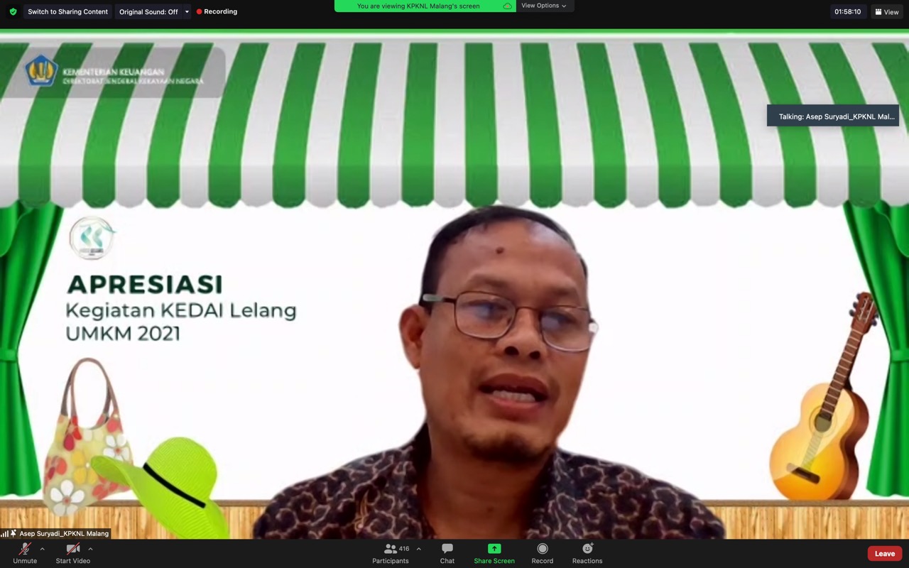 Senada dengan Dedi, Tenaga Pengkaji Harmonisasi Kebijakan DJKN Djanurindro juga menyampaikan apresiasi atas terlaksananya Kedai Lelang 2021. Menurutnya kegiatan tersebut merupakan kegiatan yang tepat dilakukan mengingat besarnya peran UMKM dalam membangun perekonomian bangsa. “99,9 kegiatan usaha yang ada di Indonesia ini adalah UMKM yang menyerap hampir 117 juta orang di tahun 2019 dengan kontribusi PDB yang cukup besar sebesar 61%. Sehingga wajar kalau kita harus dukung betul UMKM kita sebagai motor penggerak roda ekonomi,” jelasnya lebih lanjut.