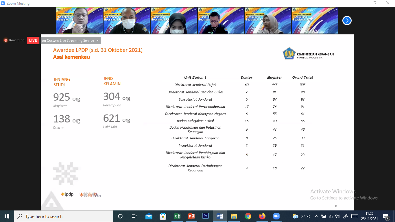 menyampaikan bahwa per-31 Oktober 2021, penerima beasiswa LPDP dari Kementerian