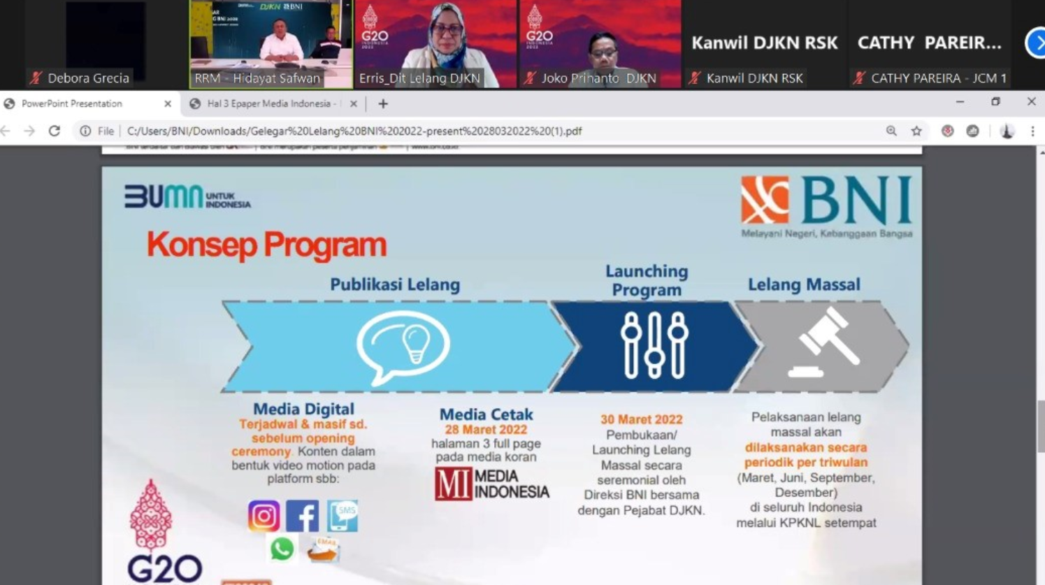 Dalam sesi diskusi yang dipandu oleh Kepala Sub Direktorat Bina Lelang II Direktorat Lelang Erris Eka Sundari, pihak BNI menyampaikan bahwa pelaksanaan lelang akan dilakukan secara periodik per triwulan pada bulan Maret, Juni, September, dan Desember 2022 di seluruh Indonesia melalui KPKNL setempat.