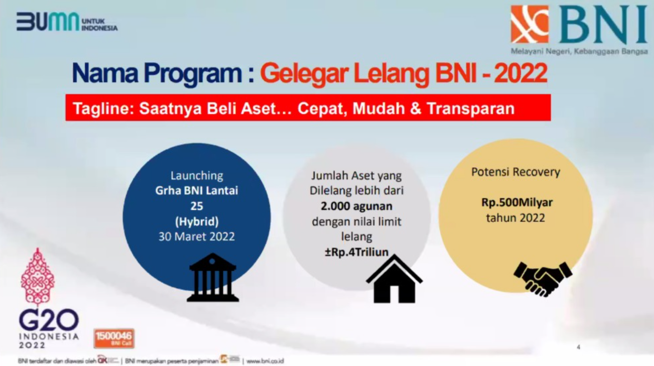 Menurut General Manager Divisi Remedial & Recovery Kredit Komersial & SME (RRM) BNI Hidayat Safwan, program ini dilatarbelakangi oleh momentum membaiknya perekonomian pasca pandemi Covid-19 yang cukup menekan kinerja perbankan di tanah air. Selain itu, juga merupakan salah satu program dan strategi Non-Business as Usual untuk percepatan pencapaian target recovery kredit melalui penjualan (lelang) agunan kredit bermasalah secara masif serta menunjang target penjualan di setiap KPKNL. Potensi recovery kredit yang akan dicapai yaitu sebesar Rp500 milyar.