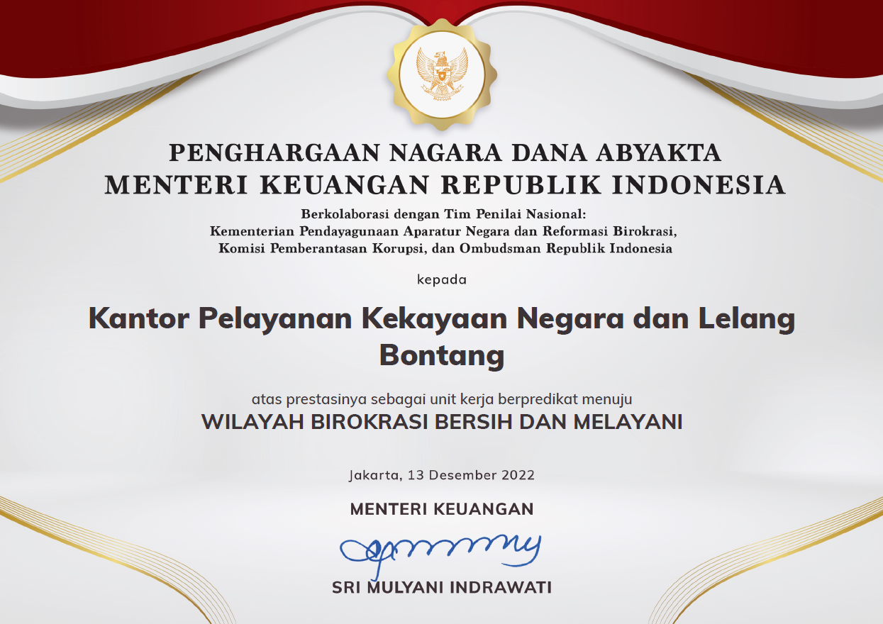 Pada Tahun 2022 ini KPKNL Bontang termasuk sebagai salah satu unit kerja yang mendapat predikat WBBM. Hal ini terlepas dari peran serta semua pegawai pada KPKNL Bontang dan dukungan dari para mitra kerja serta para pengguna layanan KPKNL Bontang.