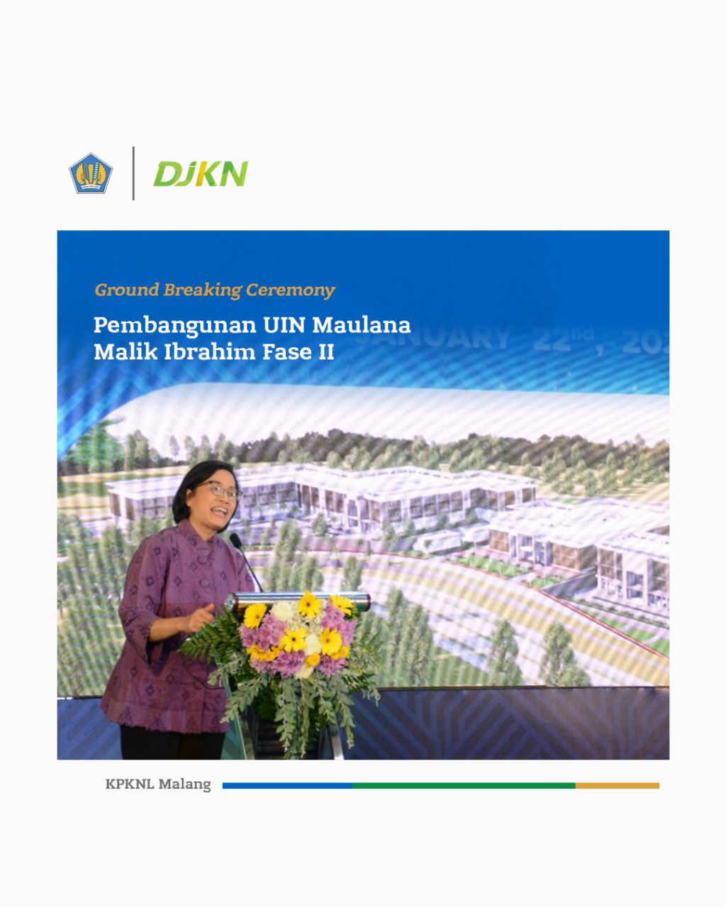 Malang – Menteri Keuangan Sri Mulyani Indrawari bersama Menteri Agama Yaqut Cholil Qoumas menghadiri uapacara peresmian peletakan batu pertama (ground breaking ceremony) pembangunan Universitas Islam Negeri Maulanan Malik Ibrahim Malang Fase II pada Sabtu, (21/1) di Malang, Jawa Timur.
