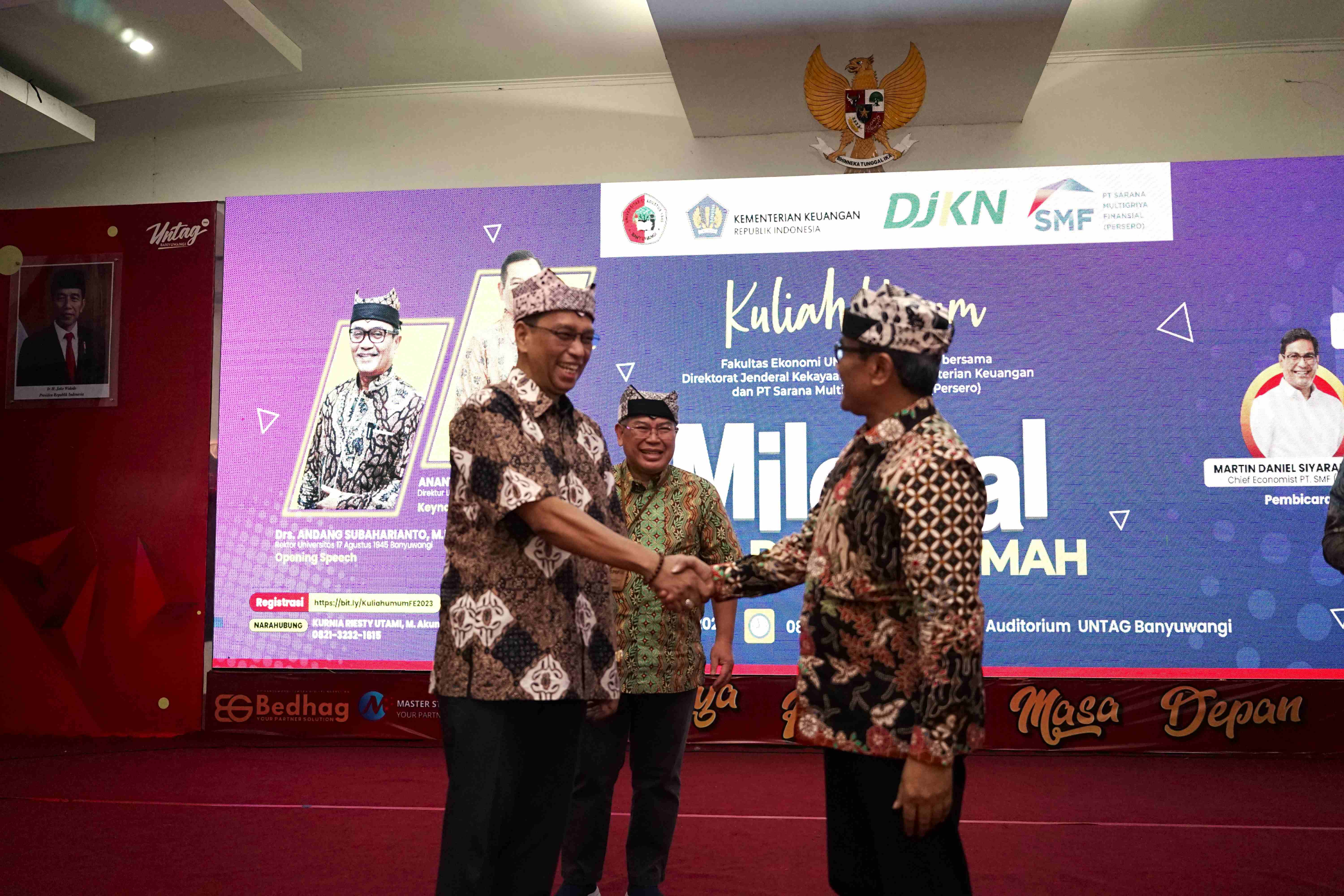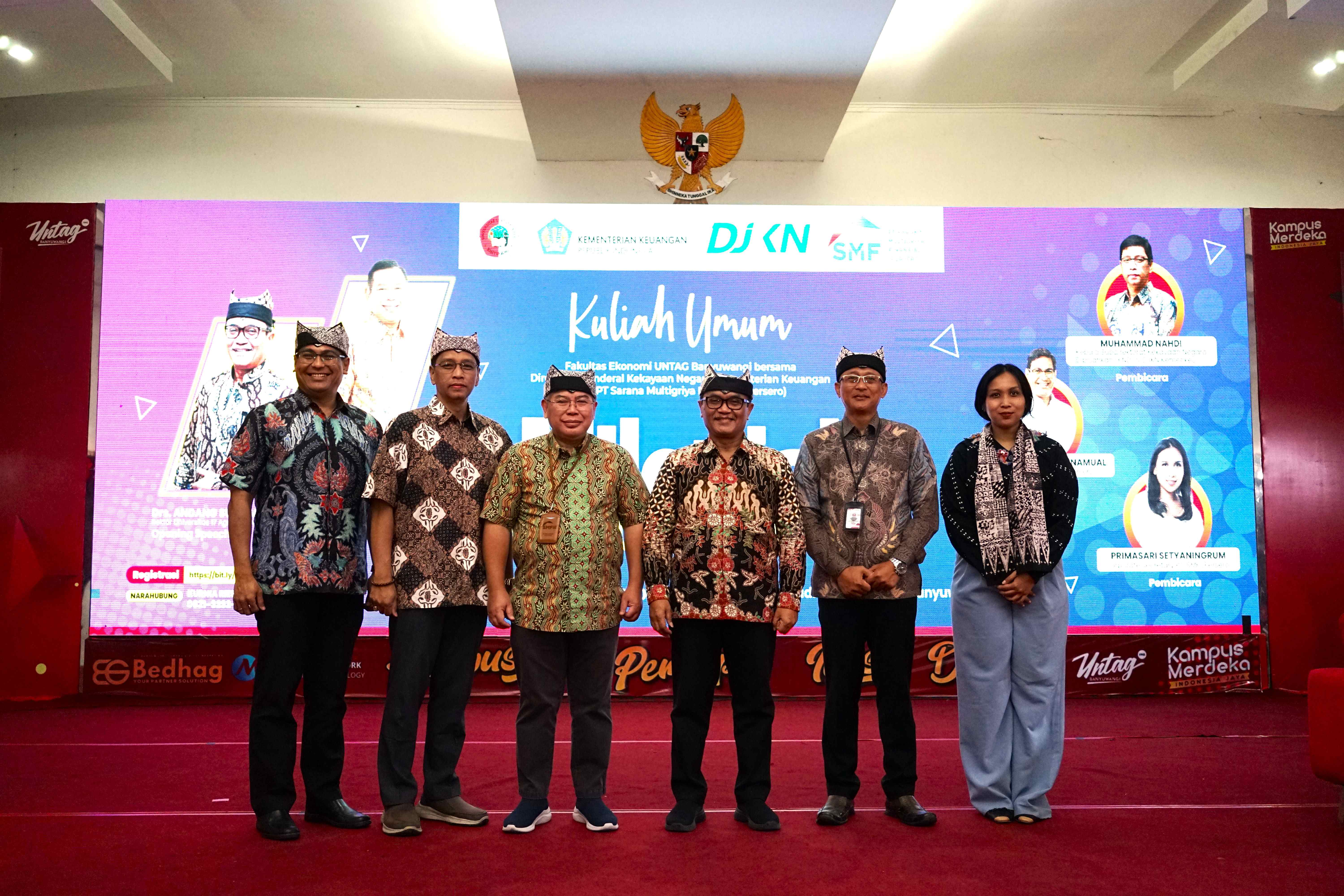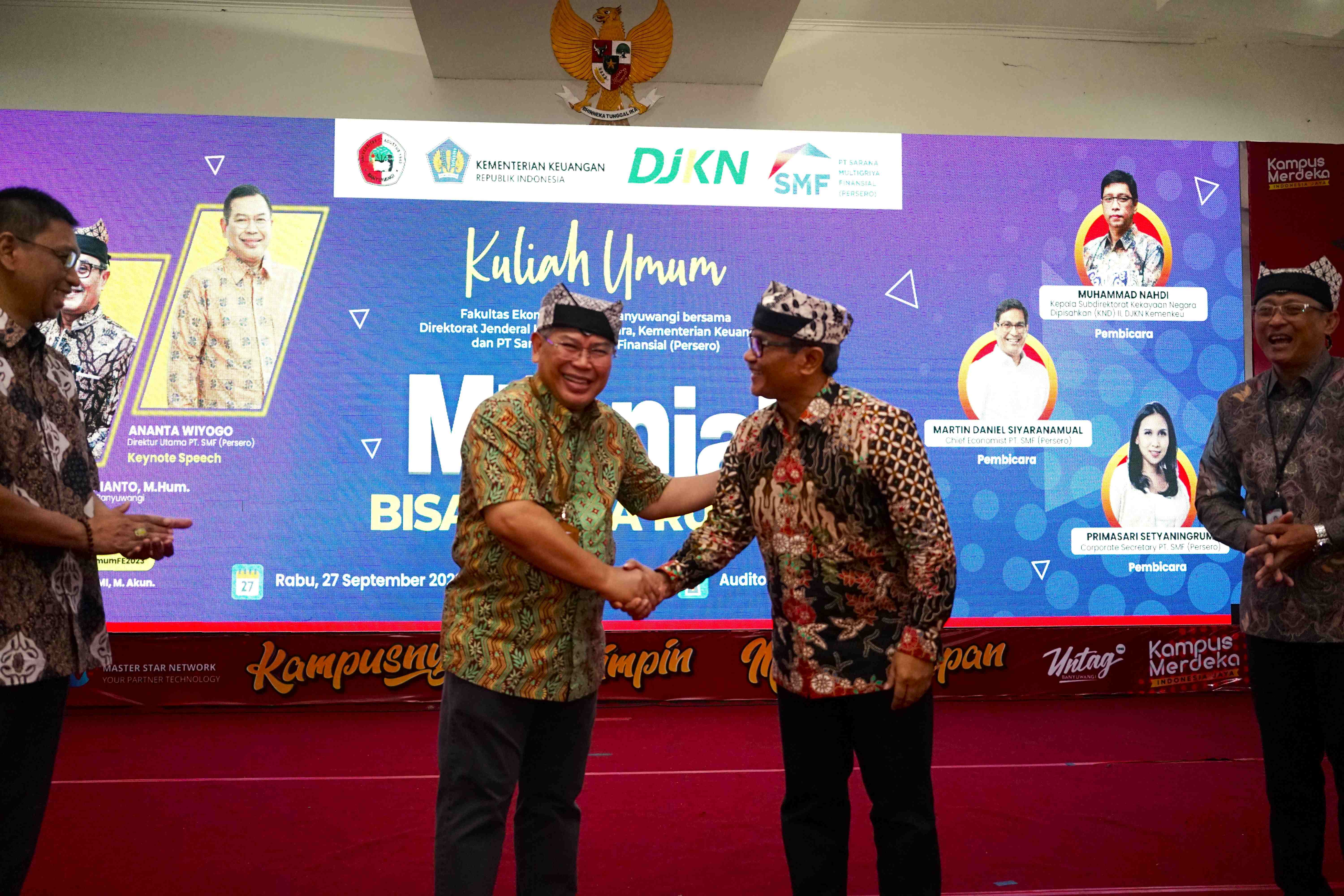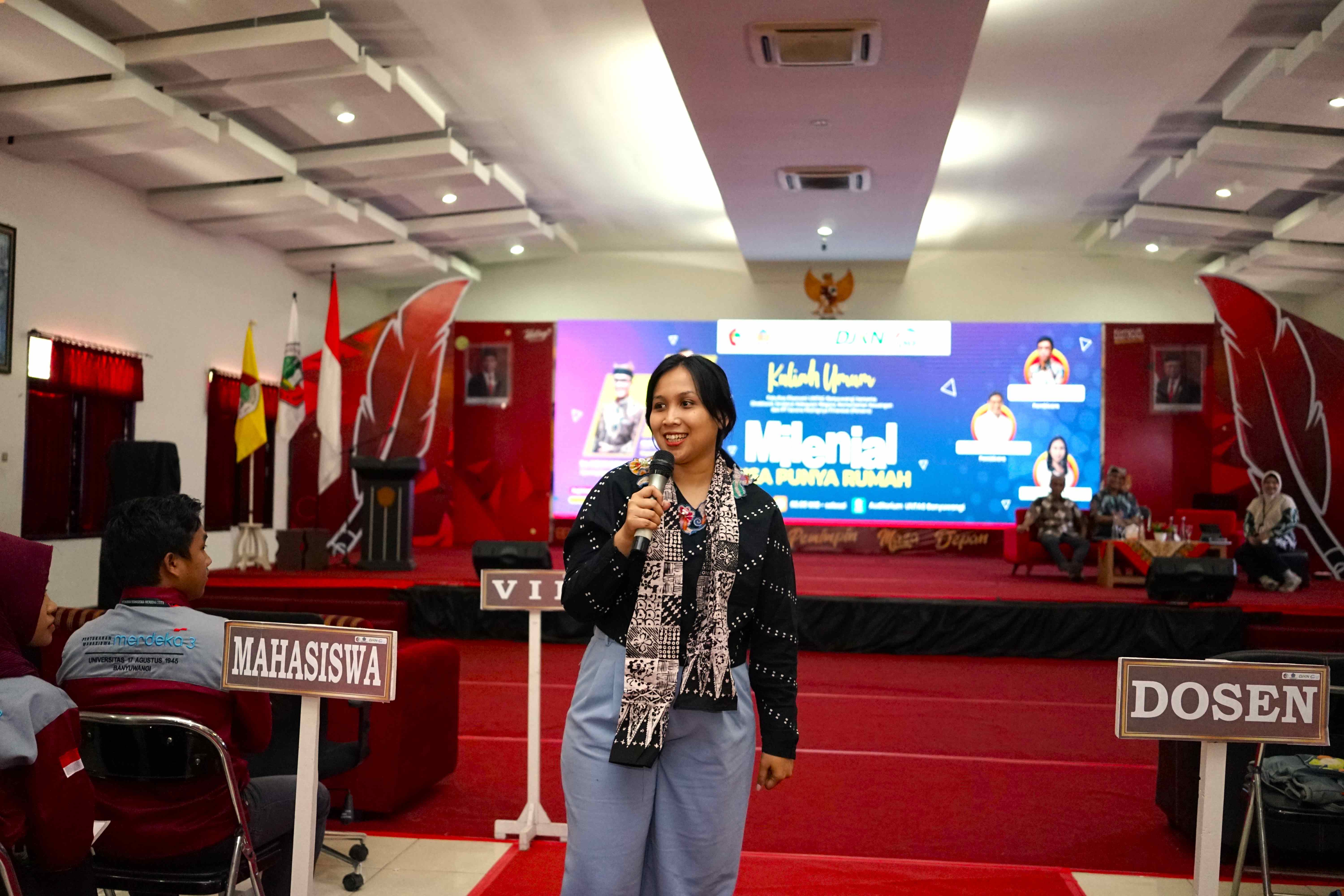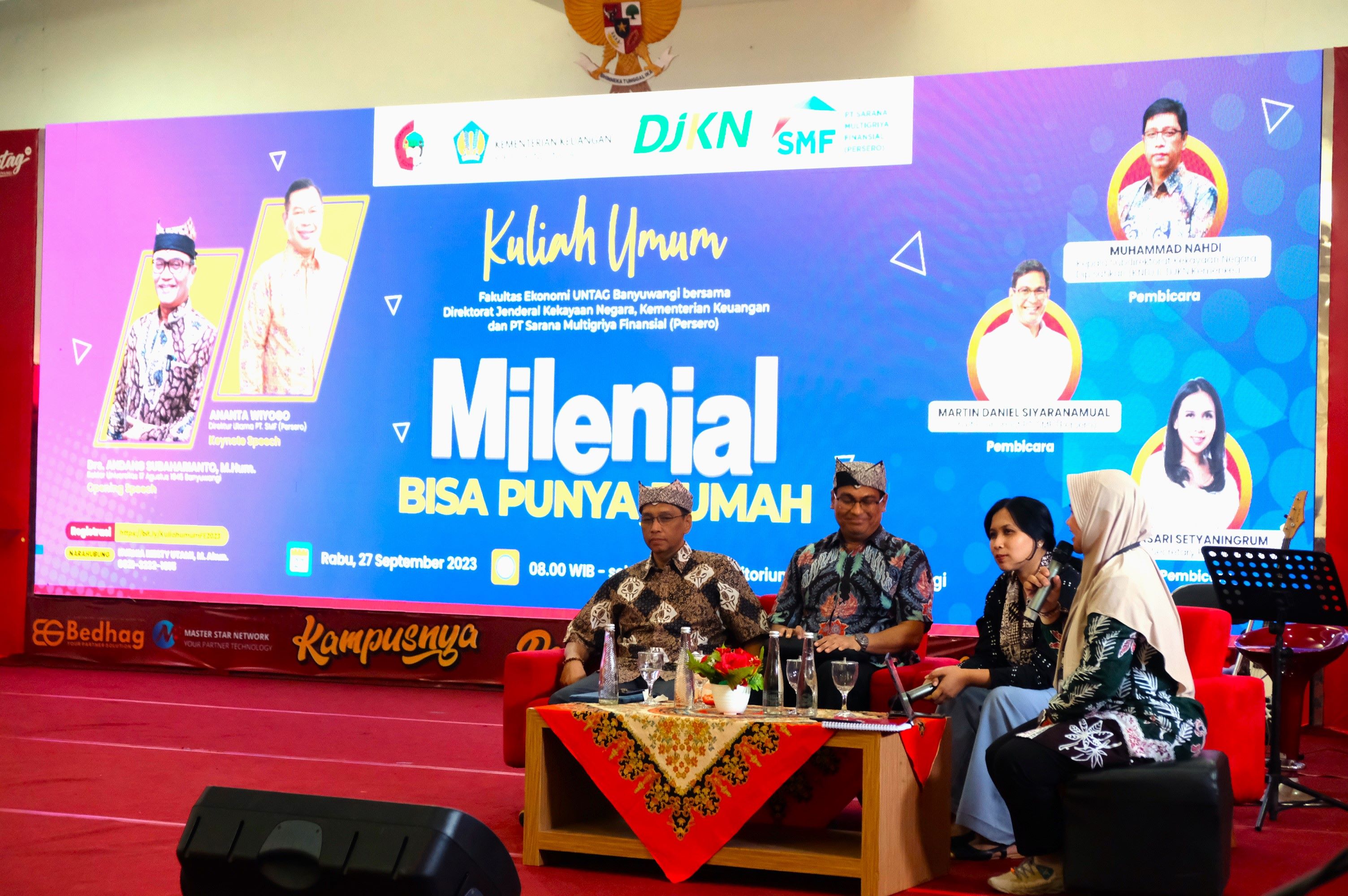Banyuwangi - “Millenial Bisa Punya Rumah” demikian seru para mahasiswa pada acara DJKN Goes to Campus 2023 di Universitas 17 Agustus 1945, Banyuwangi Rabu (27/9). Acara yang digelar oleh PT Sarana Multigriya Finansial (SMF) Persero berkolaborasi dengan Direktorat Jenderal Kekayaan Negara (DJKN), Kementerian Keuangan dihadiri tidak kurang dari 200 peserta, baik mahasiswa, dosen, maupun tamu undangan.