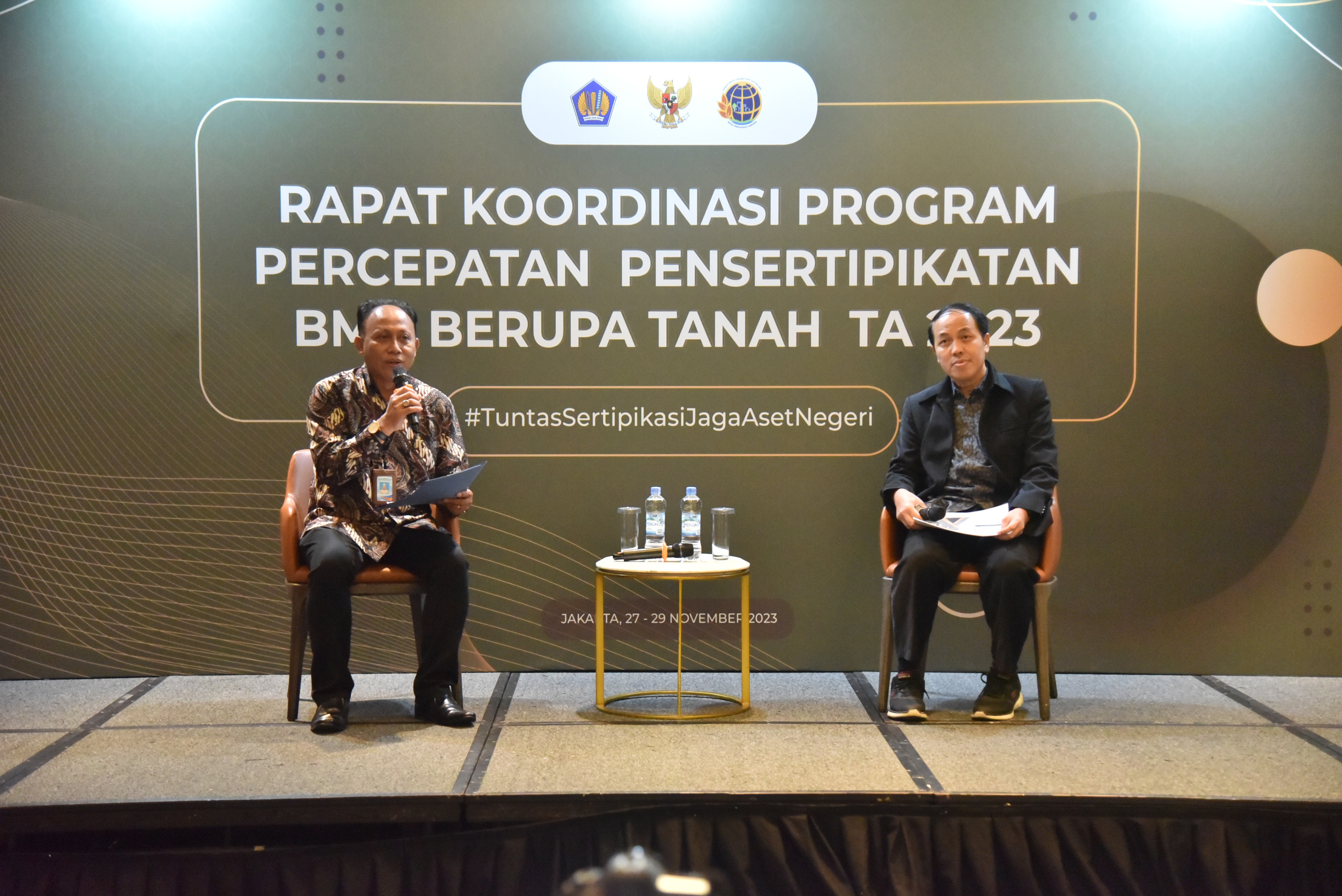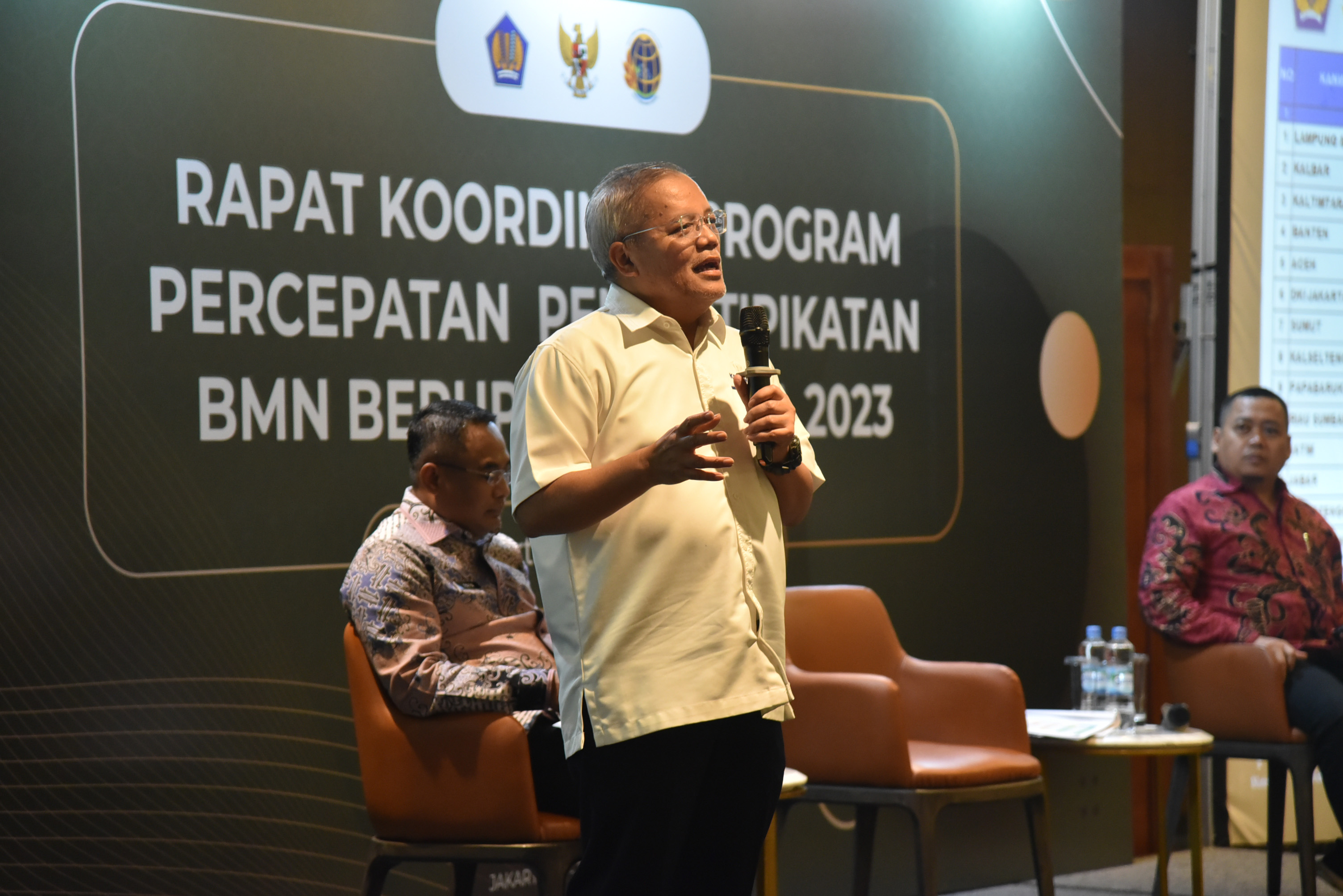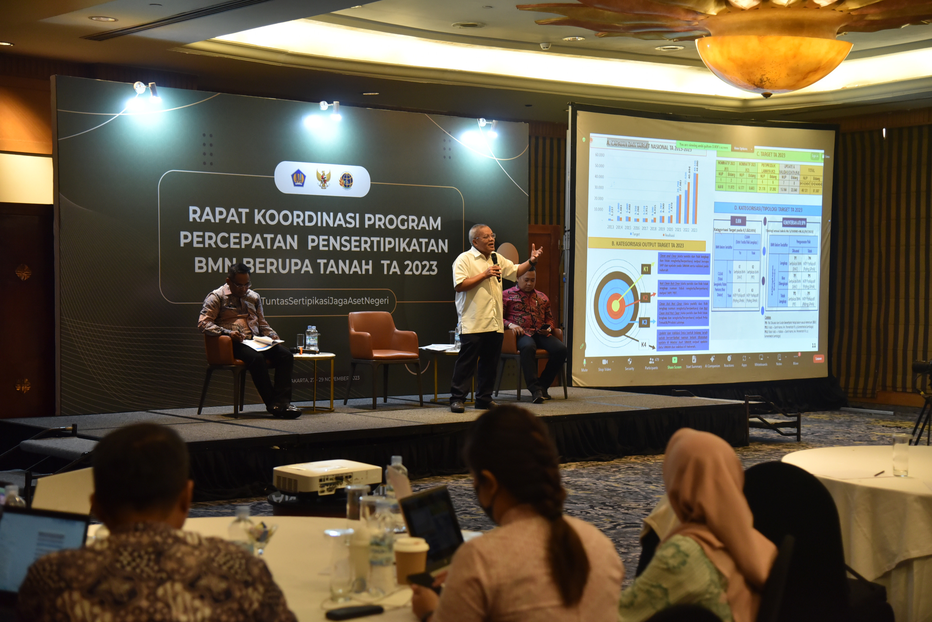 Dalam kesempatan yang sama, Direktur Perumusan Kebijakan Kekayaan Negara Encep Sudarwan menyampaikan bahwa sepanjang tahun 2023, capaian Program Percepatan Pensertipikatan BMN berupa Tanah adalah sejumlah 48.886 NUP dari target 49.131 NUP atau 99,50%. Encep menambahkan bahwa rapat koordinasi yang diselenggarakan ini dapat mendorong pencapaian target menjadi 100% di akhir 2023. Lebih lanjut, Encep juga berpesan agar rapat koordinasi dapat digunakan sebagai sarana mencari solusi atas permasalahan dan kendala terkait program sertipikasi BMN berupa tanah.