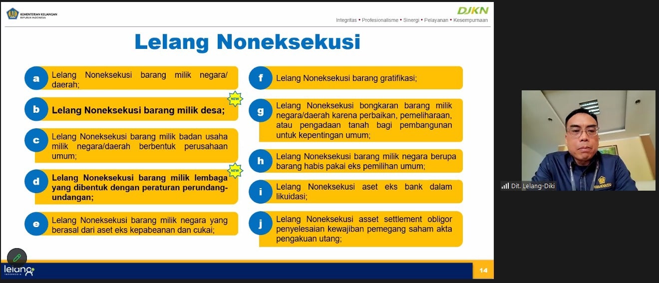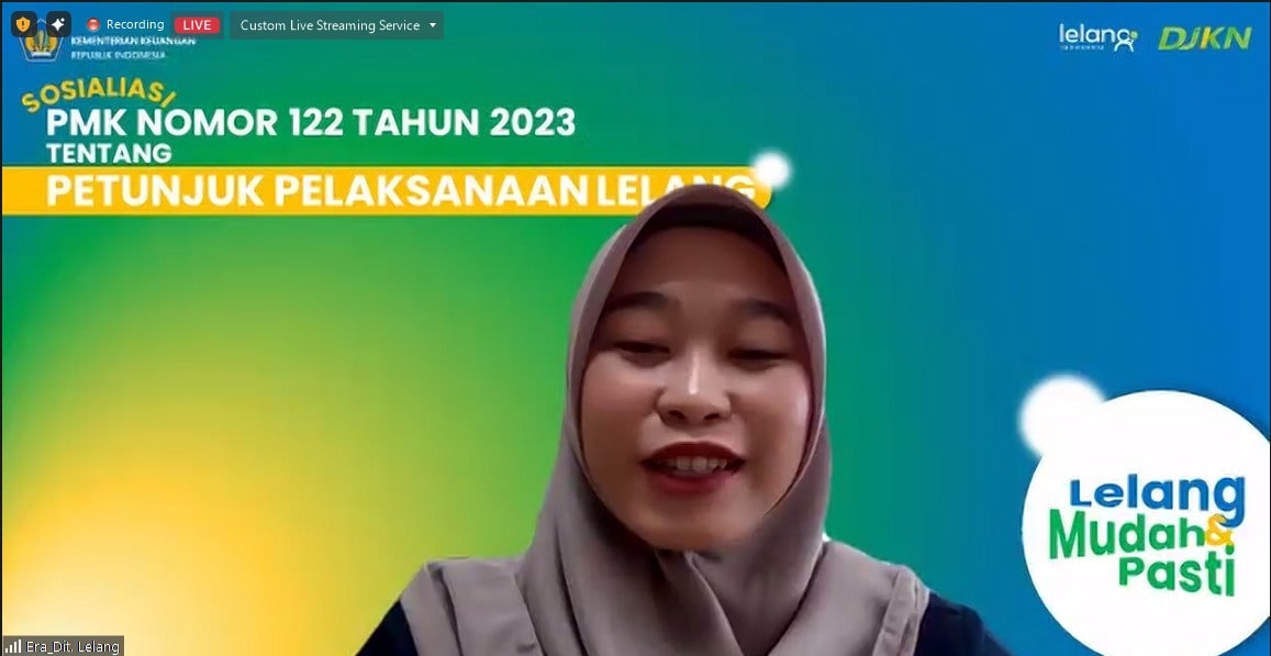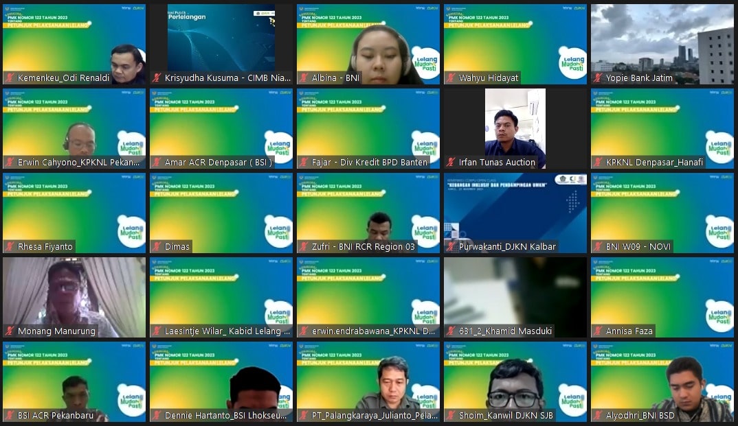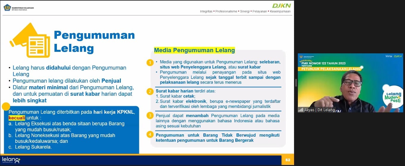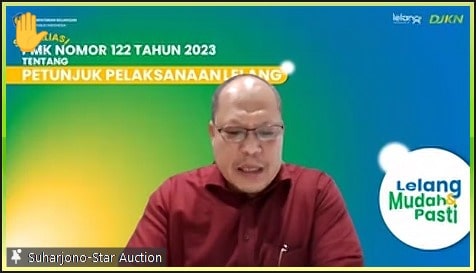 Jakarta – Direktorat Jenderal Kekayaan Negara (DJKN) c.q. Direktorat Lelang melakukan Sosialisasi Peraturan Menteri Keuangan (PMK) Nomor 122 Tahun 2022 tentang Petunjuk Pelaksanaan Lelang, pada Rabu (20/12) secara daring.