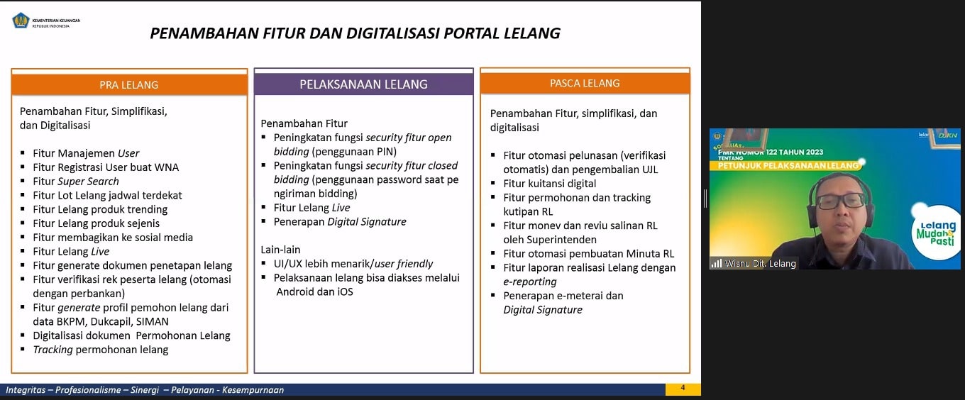 “Pada tanggal 1 Januari 2024, baik Peraturan Menteri Keuangan tentang Petunjuk Pelaksanaan Lelang berikut Aplikasi Lelang yang baru akan efektif berjalan sebagai tools dalam memberikan layanan lelang bagi Bapak/Ibu sekalian,” ujar Joko.