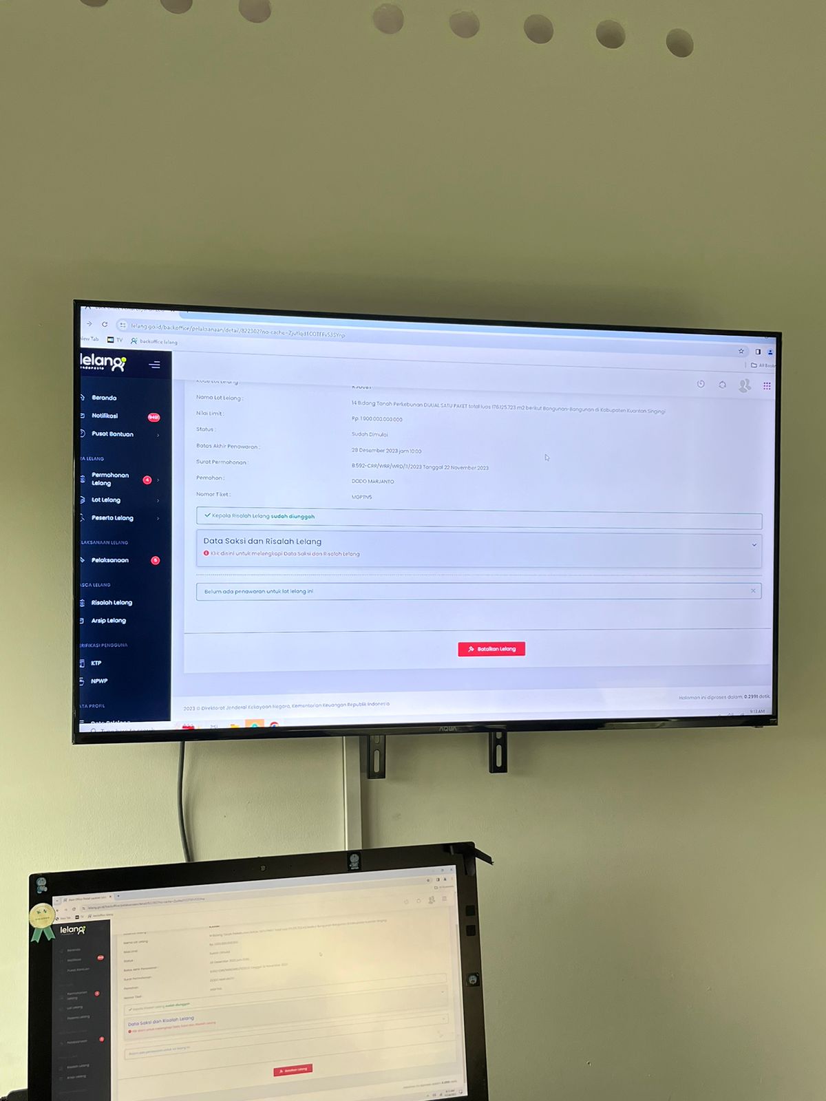 Pekanbaru – Kantor Pelayanan Kekayaan Negara dan Lelang (KPKNL) Pekanbaru berhasil melelang 14 bidang tanah perkebunan yang ditawarkan dalam satu paket dengan total luas tanah lebih dari 176 juta m2 senilai Rp1,9 triliun pada Kamis (28/12) di Pekanbaru. Dipimpin Pelelang Erwin Cahyono dan dihadiri oleh Penjual dari Kantor Pusat Bank BRI, satu paket tanah kebun ini ditawarkan dengan cara penawaran open bidding melalui Portal Lelang Indonesia lelang.go.id.