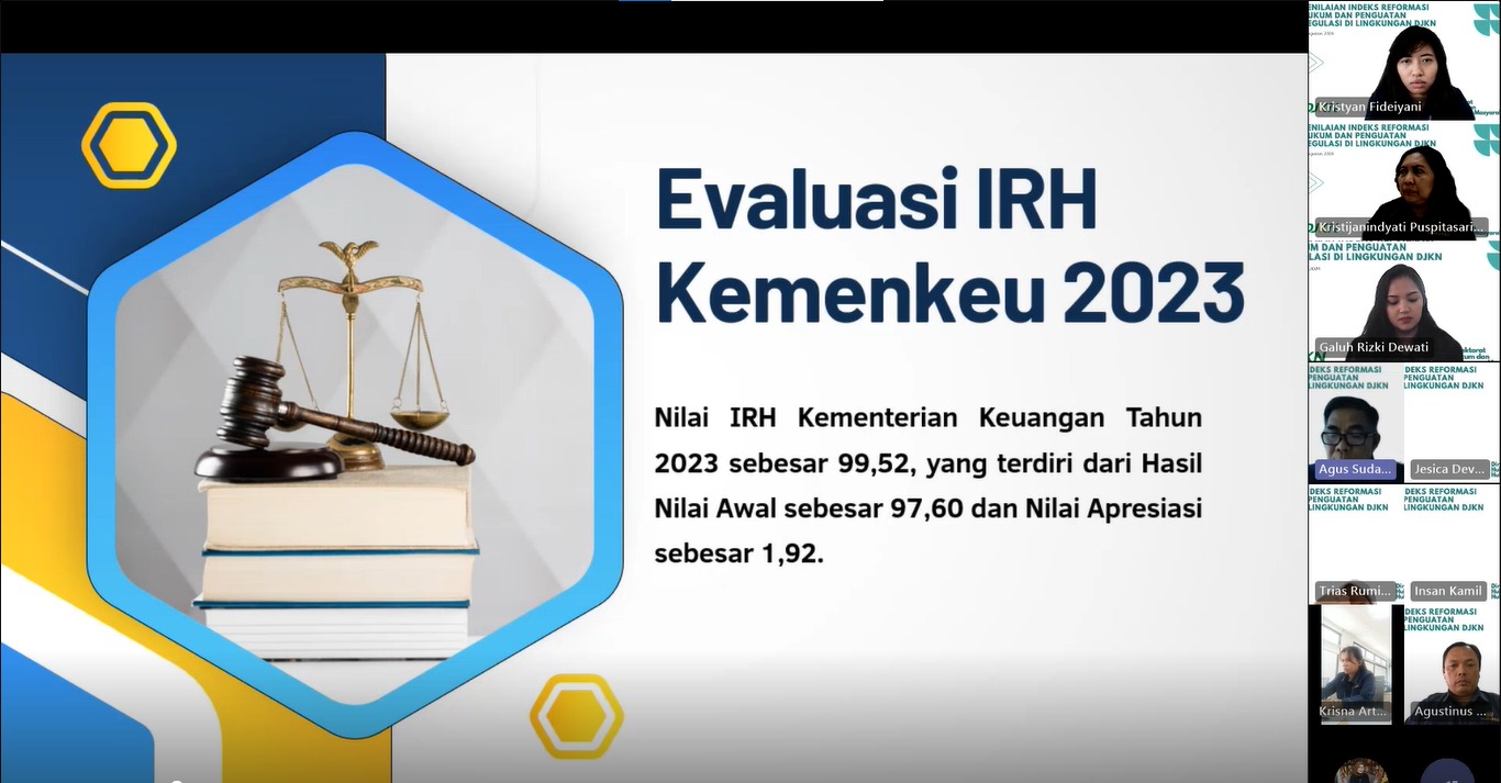 Acara yang diselenggarakan secara daring ini menghadirkan dua orang narasumber dari Biro Hukum Sekretariat Jenderal Kementerian Keuangan, yaitu Kepala Bagian Hukum Anggaran, Perimbangan Keuangan, Perbendaharaan, dan Badan Layanan Umum Agus Sudaya dan Kepala Subbagian Tata Usaha Natalia Samosir. Di awal paparannya, Agus Sudaya mengapresiasi DJKN sebagai unit eselon I pertama di Kementerian Keuangan yang melakukan diseminasi penilaian IRH. Menurutnya, disiplin dalam tertib administrasi penyusunan peraturan perundang-undangan merupakan hal yang sangat penting dan membutuhkan perhatian dari seluruh unit pemrakarsa. Penyusunan peraturan memerlukan usaha yang besar, sehingga dokumentasi administrasi yang baik harus selalu dilakukan.