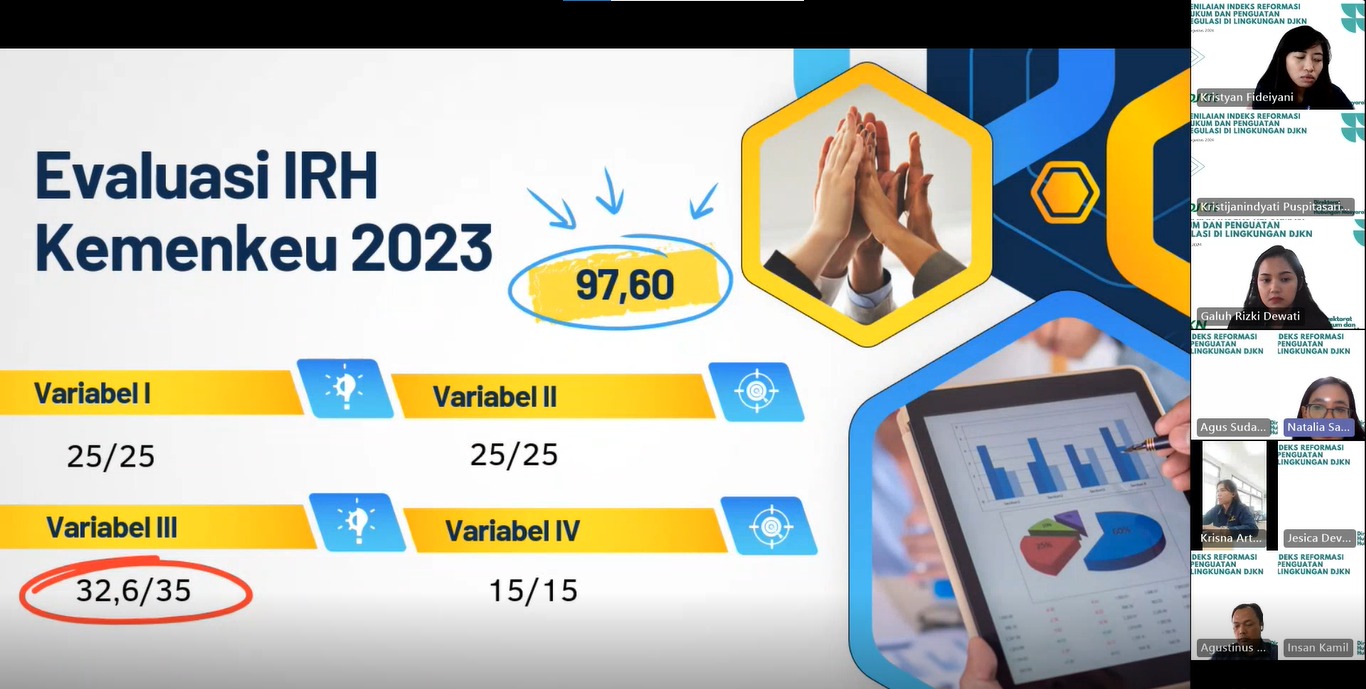 Pada penilaian IRH tahun 2023, Kementerian Keuangan memperoleh penghargaan peringkat ketiga dengan perolehan nilai sebesar 99,52. Peringkat penilaian IRH ini diharapkan mengalami peningkatan di tahun 2024. Keterlibatan pimpinan tinggi dalam pembahasan harmonisasi dan pemenuhan dokumen menjadi perhatian penting agar seluruh persyaratan penilaian IRH 2024 dapat terpenuhi.