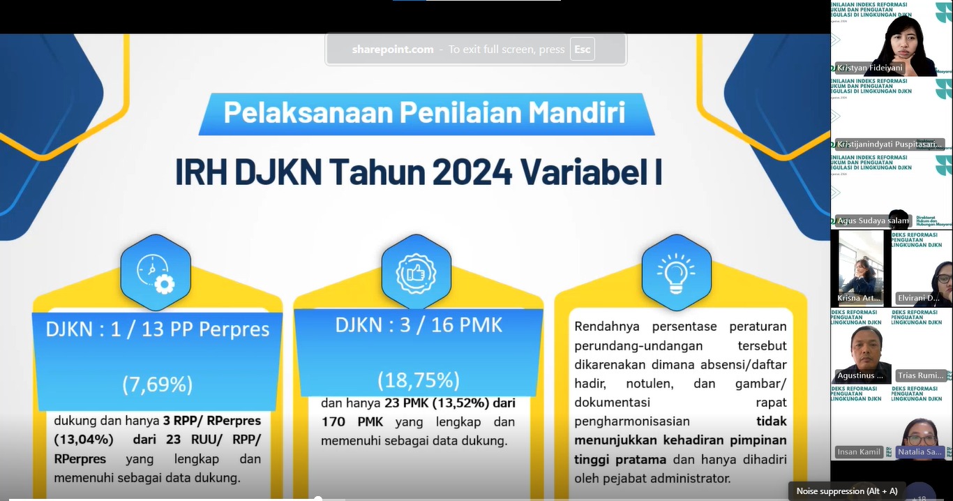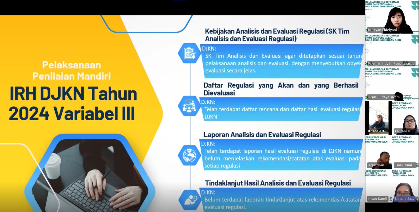 Jakarta - Direktorat Hukum dan Hubungan Masyarakat Direktorat Jenderal Kekayaan Negara (DJKN) menyelenggarakan rapat penilaian Indeks Reformasi Hukum (IRH) Kementerian Keuangan dan Penguatan Regulasi pada Rabu, 14 Agustus 2024. Kegiatan ini dihadiri oleh perwakilan Direktorat Perumusan Kebijakan Kekayaan Negara, Direktorat Kekayaan Negara Dipisahkan, Direktorat Penilaian, dan Direktorat Lelang sebagai unit pemrakarsa peraturan perundang-undangan di lingkungan DJKN. Kepala Subdirektorat Peraturan Perundang-Undangan Kristijanindyati Puspitasari yang membuka acara tersebut menyampaikan bahwa rapat ini tidak sekedar bertujuan untuk mendukung dan mempersiapkan penilaian IRH, tetapi juga untuk meningkatkan tertib administrasi dan kualitas regulasi di DJKN.