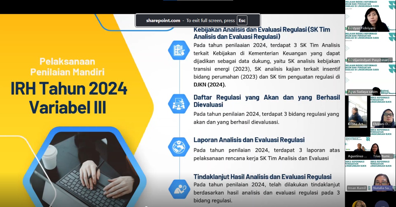 Natalia menjelaskan bahwa variabel pertama dan ketiga perlu disiapkan masing-masing unit eselon I, sementara variabel kedua dan keempat akan disiapkan Biro Hukum. Dalam penilaian IRH Kementerian Keuangan 2024, terdapat tiga Peraturan Pemerintah (PP) dan 23 Peraturan Menteri Keuangan (PMK) yang memenuhi syarat untuk dilakukan penilaian. Dari DJKN sendiri, terdapat satu PP dan tiga PMK yang memenuhi persyaratan tersebut.