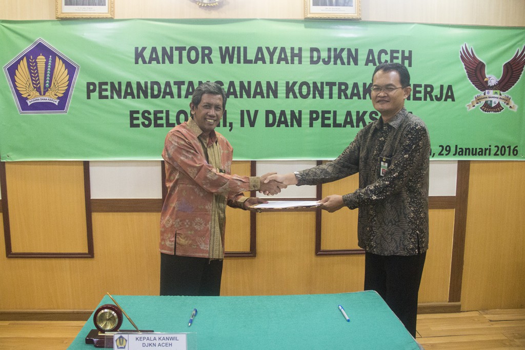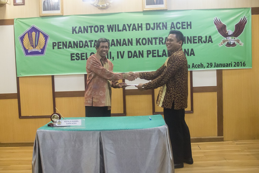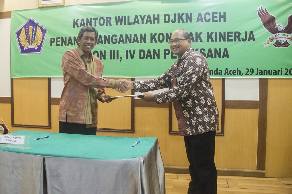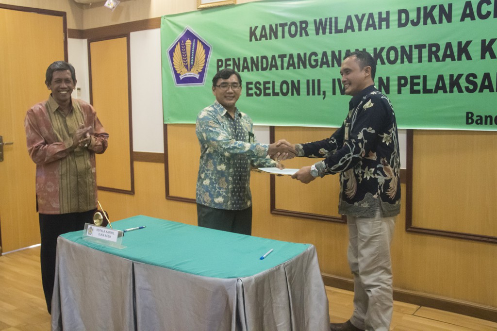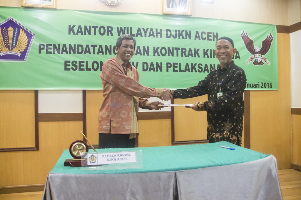 Kegiatan penandatanganan kontrak kinerja yang merupakan bentuk gentlemen agreement, pertama kali dilakukan oleh Kepala Bagian Umum, Andi Soegiri, yang dilanjutkan secara berturut-turut oleh Nofiansyah sebagai Kepala Bidang Pengelolaan Kekayaan Negara, Kepala Bidang Penilaian, Mardhanus Riyanto, Kepala Bidang Piutang Negara, Gatot Muharto, Kepala Bidang Lelang, Dirmanti, Kepala Bidang Kepatuhan Internal Hukum dan Informasi, T. Uzir serta Kepala KPKNL Banda Aceh, Aceh Hadinata dan Kepala KPKNL Lhokseumawe, Muhammad Joni.