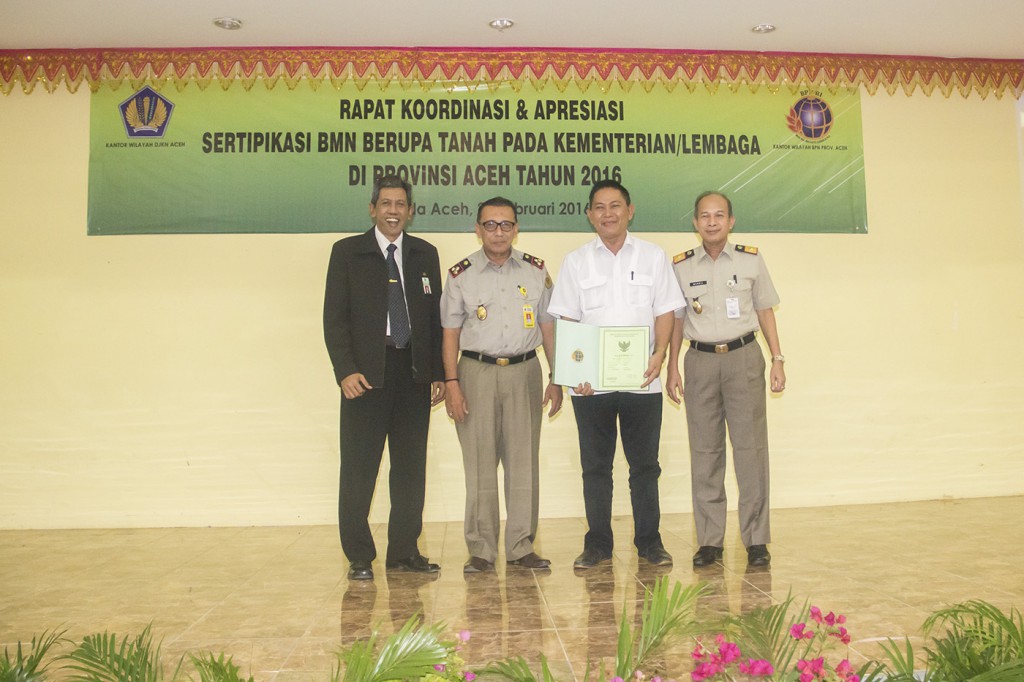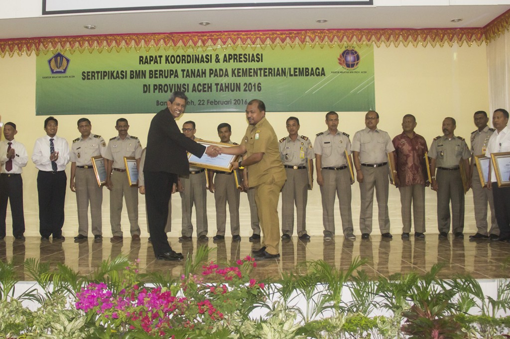 Selain untuk melakukan koordinasi atas program sertifikasi tahun 2016 di Propinsi Aceh, pelaksanaan rapat kali ini didedikasikan untuk para pihak yang telah berkontribusi dalam tercapainya target sertifikasi atas BMN berupa tanah dengan memberikan apresiasi berupa penyerahan piagam penghargaan kepada Kanwil BPN Provinsi Aceh, Kantor Pertanahan Kabupaten/Kota, dan Satuan Kerja Kementerian/Lembaga penerima manfaat sebagai bentuk penghargaan yang tidak bisa dinilai dengan uang atas jerih payah mengamankan tanah negara.
