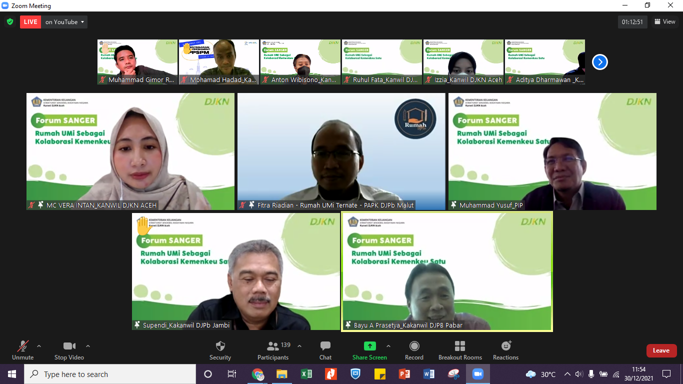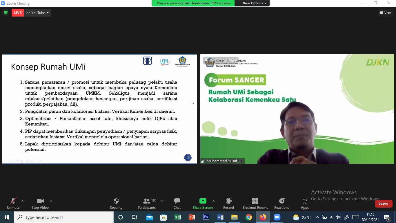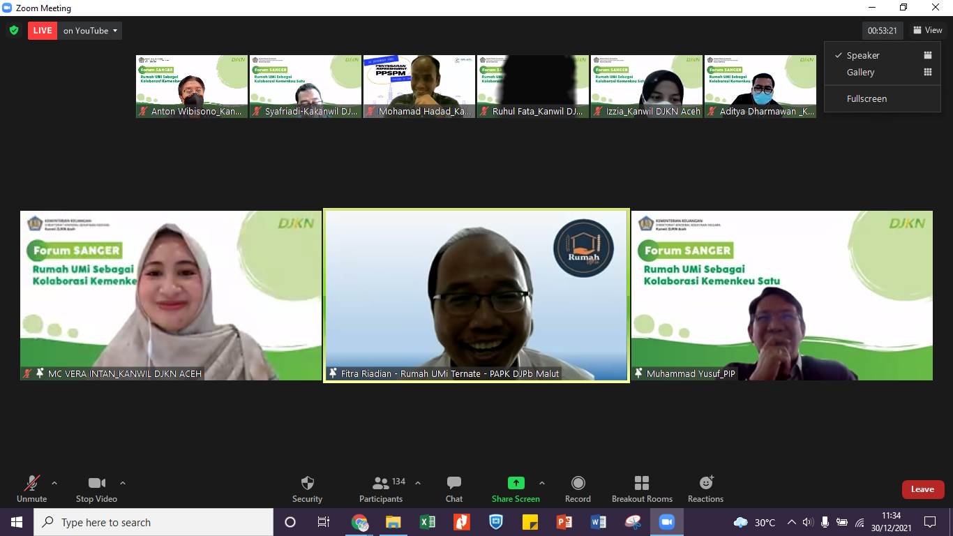 Acara yang dipandu oleh Vera Intan Karlina ini dihadiri oleh hampir 200 partisipan dari Kantor Wilayah DJKN, DJPb, DJP, serta DJBC seluruh Indonesia dan ditayangkan melalui aplikasi zoom meeting maupun kanal youtube Kanwil DJKN Aceh. Acara dibuka oleh Kepala Kanwil DJKN Aceh, Syukriah HG, yang pada intinya menyampaikan terima kasih atas kesediaan BLU PIP untuk hadir dan berbagi pengetahuan dengan Keluarga Besar Kemenkeu Aceh. Selanjutnya Kepala Kanwil DJPb Propinsi Aceh, Syafriadi, dalam sambutannya menyatakan bahwa Rumah UMi bisa menjadi sarana untuk memperkuat kolaborasi Kemenkeu Satu dan media untuk memberikan sumbangsih kepada masyarakat di Aceh.