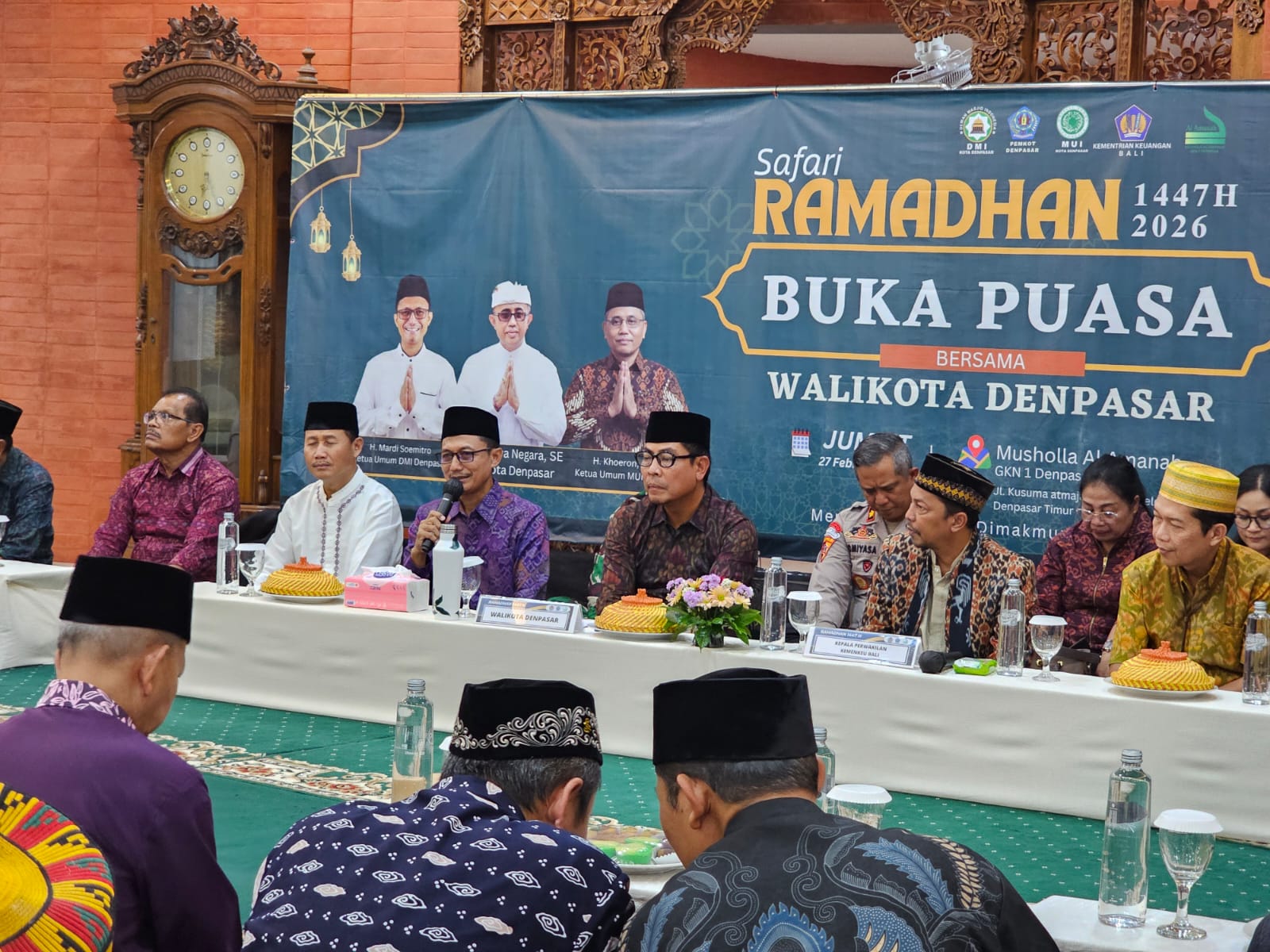 Denpasar - Wakil Walikota Denpasar I Kadek Arya Wibaya menghadiri kegiatan Safari Ramadhan 1447 H atau bertepatan di hari Jum'at (27/2) di Mushola Al Amanah Gedung Keuangan Negara (GKN) I Denpasar, kehadiran beliau menggantikan Walikota Denpasar I Gusti Ngurah Jaya Negara yang berhalangan hadir dikegiatan rutin tahunan ini dikarenakan alasan kesehatan. Turut hadir mendampingi Walikota Ketua Dewan Masjid Indonesia (DMI) Cabang Denpasar H. Mardi Soemitro dan Ketua Majelis Ulama Indonesia (MUI) Denpasar H. Khoeron, M.Pd.I, serta para Pimpinan Forum Kordinasi Pimpinan Daerah (Forkompimda) Kota Denpasar.