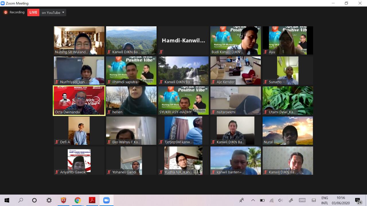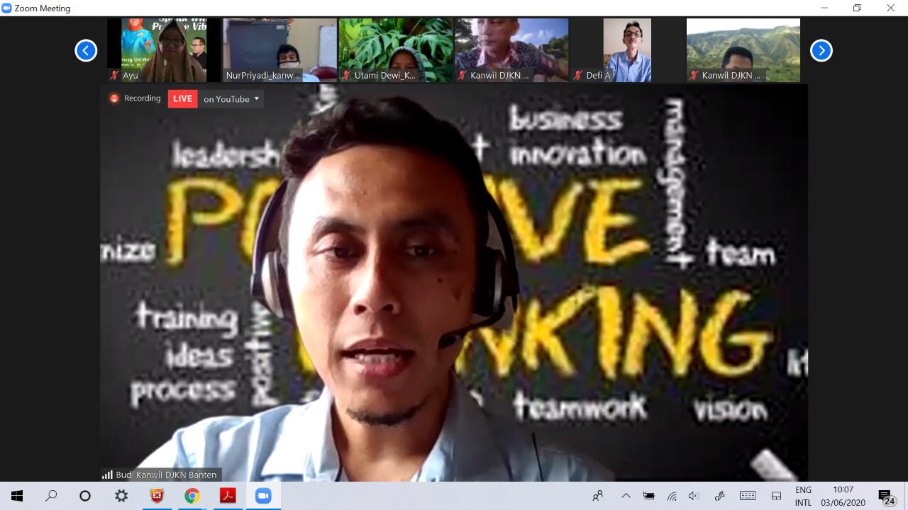 Kanwil DJKN Banten mengadakan Galang Selamat Pagi dengan tema Speaking With Positive Vibe dengan nara sumber Kakanwil DJKN Banten, Nuning SRi Rejeki Wulandari dan Kasie lelang II Kanwil DJKN Banten, Okta Dwinanda dan moderator oleh Budi Sulistyawan. Rabu (3/6).