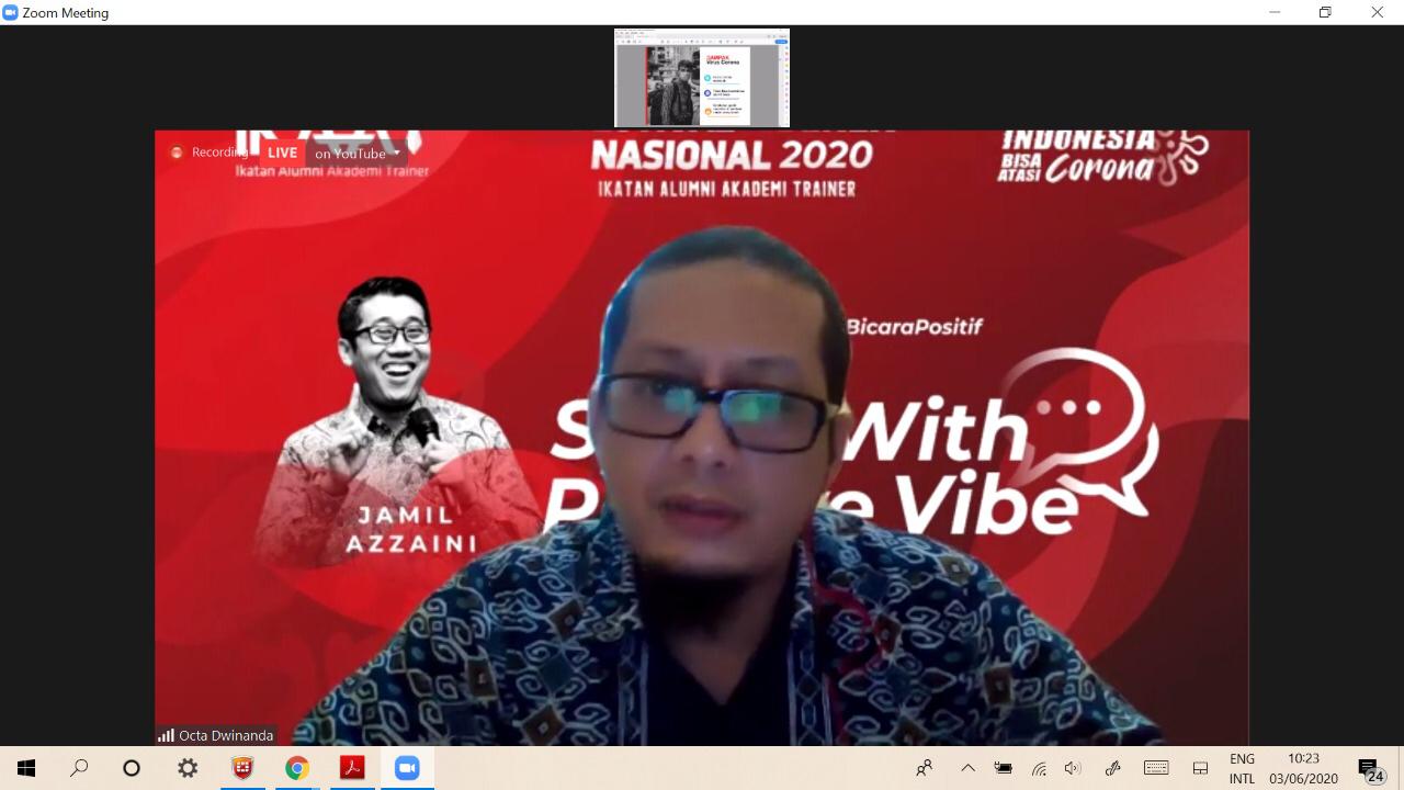 Sedangkan paparan Okta Dwinanda lebih menyajikan bagaimana kita menyikapi pandemic covid-19 ini dikeseharian kita dengan pikiran positif. Dalam masa pandemi Covid-19, kita harus selalu berpikir positif dengan cara mengurangi akses informasi negatif tentang Covid -19, membiasakan respon positif dan berusaha menjernihkan hati serta tularkan vibrasi positif ke lingkungan kita.