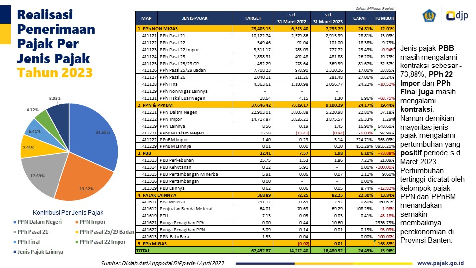 Pelaksanaan APBN di Banten hingga akhir Maret 2023, dari sisi Pendapatan Negara mencatat realisasi Rp20,25 triliun atau 24,89