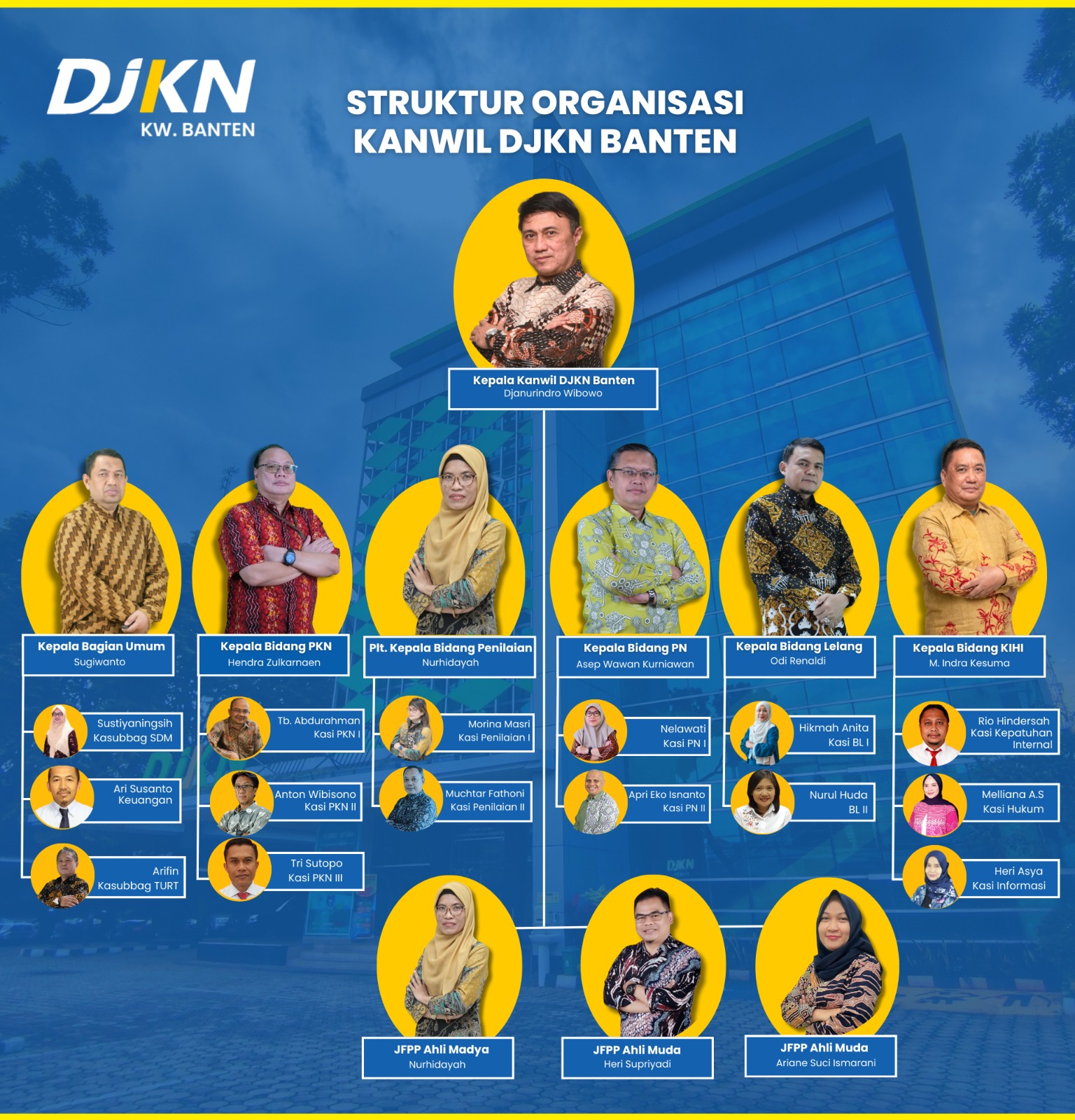 Saat ini Kepala Kanwil DJKN Banten dijabat oleh Djanurindro Wibowo dengan dibantu oleh Kepala Bagian Umum, Sugiwanto; Pejabat Fungsional Penilai Pemerintah Madya, Nurhidayah.; Kepala Bidang Pengelolaan Kekayaan Negara, Hendra Zulkarnaen; Plt. Kepala Bidang Penilaian, Nurhidayah Kepala Bidang Piutang Negara, Asep Wawan Kurniawan; Kepala Bidang Lelang, Odi Renaldi; Kepala Bidang Kepatuhan Internal, Hukum dan Informasi, M. Indra Kesuma; Pejabat Fungsional Penilai Pemerintah Muda, Heri Supriyadi; dan Ariane Suci Ismarani.
