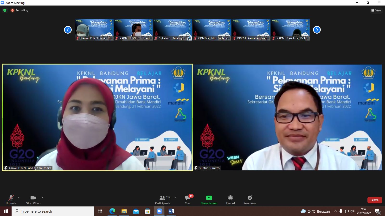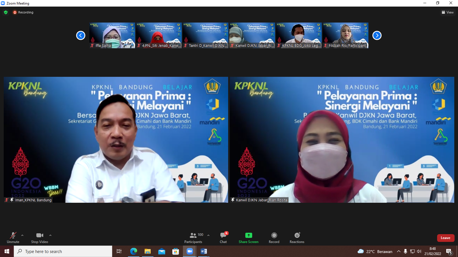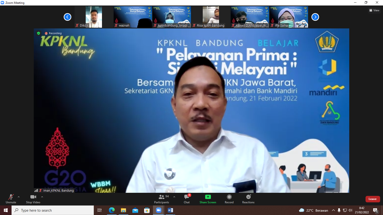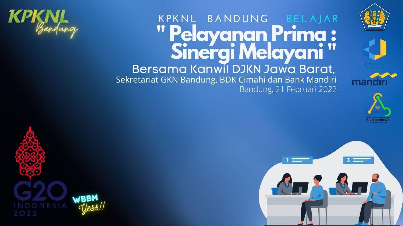 Kepala Kanwil DJKN Jawa Barat membuka pelatihan pelayanan prima (service excellent) yang merupakan pelatihan untuk mewujudkan perubahan pola pikir dan budaya kerja yang berorientasi pada “Service Excellent” bagi seluruh pegawai yang terlibat dalam pelayanan di Area Pelayan Terpadu Bersama DJKN Bandung (area Pelayanan Terpadu KPKNL Bandung dan Kanwil DJKN Jawa Barat). Program ini diusung oleh KPKNL Bandung bekerja sama dengan Mandiri University dan Balai Diklat Keuangan Cimahi. Pembukaan pelatihan dilaksanakan secara daring pada hari Senin 21 Februari 2022. Acara yang bertajuk Sinergi Melayani ini dihadiri oleh seluruh pegawai KPKNL Bandung, Kanwil DJKN Jawa Barat dan juga Bank Mandiri. Acara ini dipandu oleh Iman Abdurrahman dan Rian Rosita Luthfi. Pelatihan dilaksanakan selama 2 hari, yaitu tanggal 21 secara daring dan 22 Februari 2022 secara tatap muka bertempat di Kampus Mandiri University Jalan Soekarno Hatta Bandung. Seluruh peserta pelatihan terlebih dahulu diswab antigen untuk memastikan kesehatannya.
