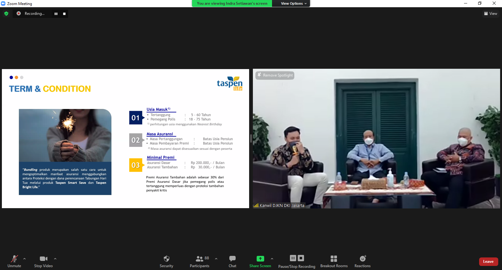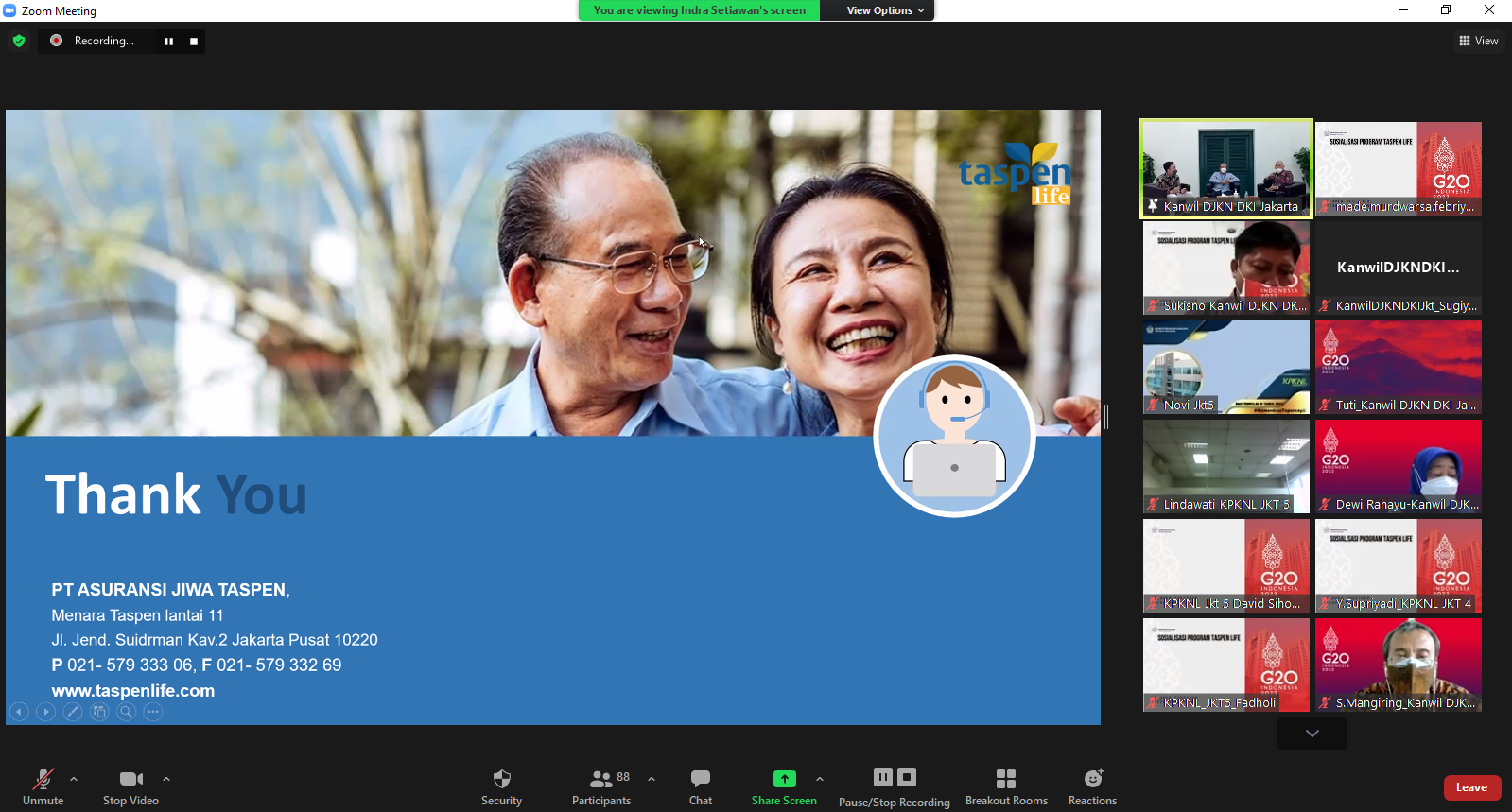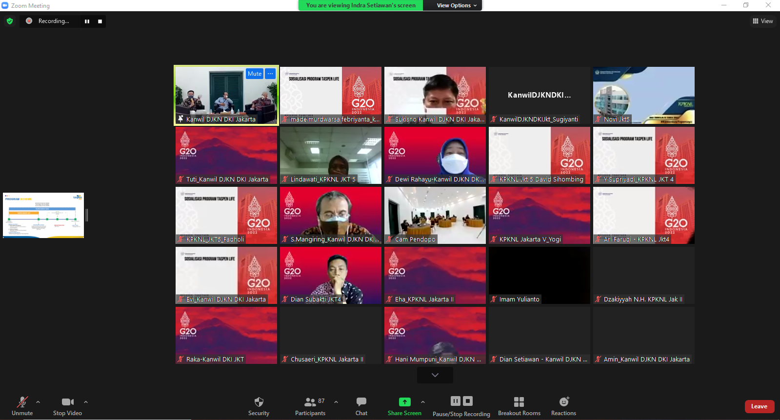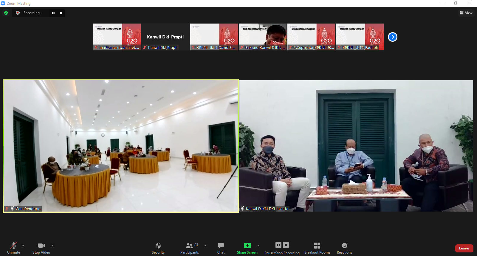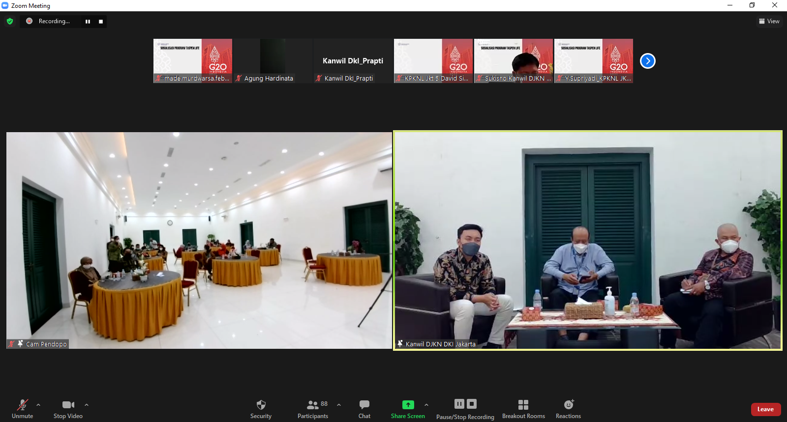 Jakarta – Kantor Wilayah (Kanwil) Direktorat Jenderal Kekayaan Negara (DJKN) DKI Jakarta mengadakan Sosialisasi Peningkatan Kesejahteraan Melalui Program Taspen Life dengan mengundang narasumber dari PT Taspen (Persero) Kantor Cabang Utama (KCU) Jakarta pada hari Rabu, 19 Januari 2022. Acara ini dilaksanakan secara hybrid, baik secara online melalui aplikasi Zoom Meeting dan offline terbatas di Aula Pendopo Kanwil DJKN DKI Jakarta dan diikuti oleh seluruh pegawai Kanwil DJKN DKI Jakarta.