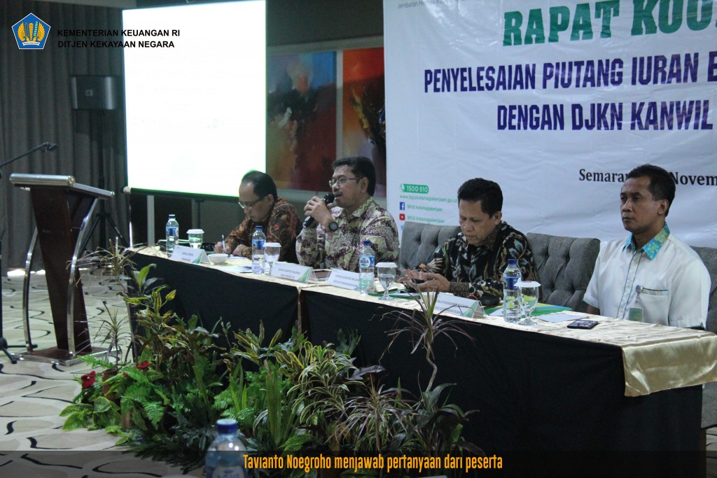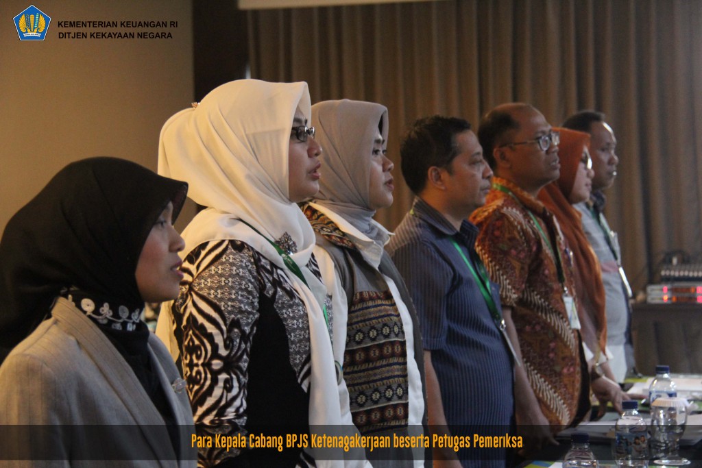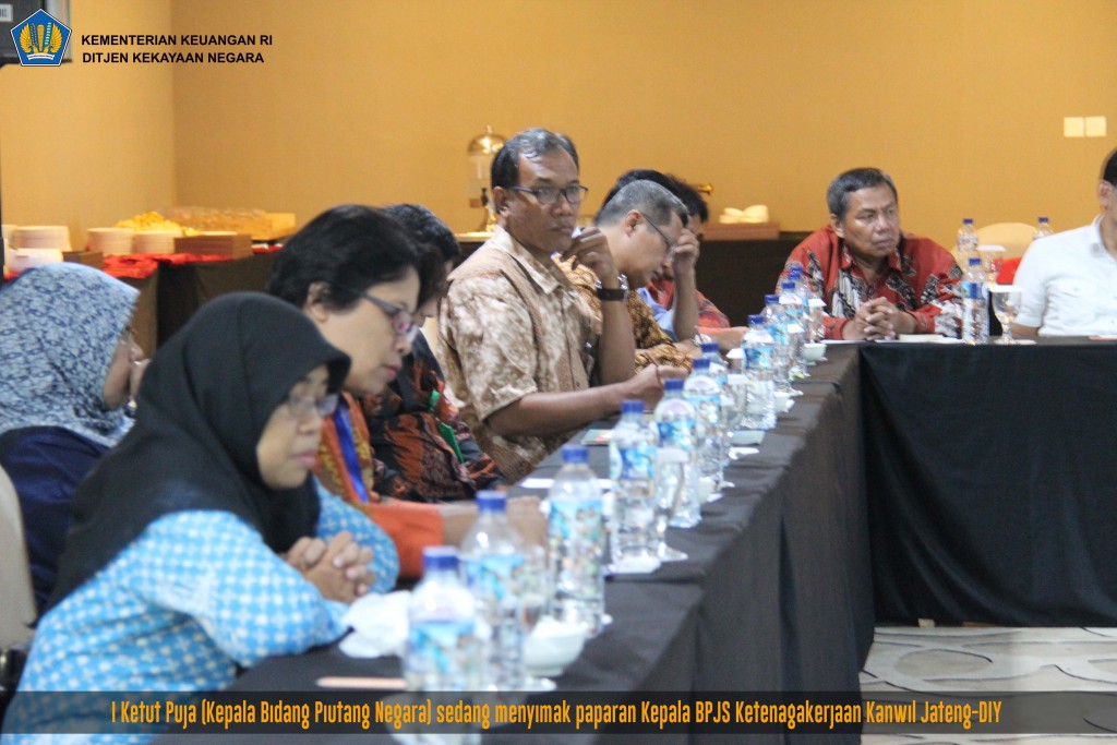 Hadir dalam rapat Kepala Kanwil DJKN Jateng dan DI Yogyakarta beserta tim yang terdiri atas para Kepala KPKNL, Kepala Bidang Piutang Negara, Kepala Seksi Piutang Negara I, dan Kepala Seksi Piutang Negara KPKNL sedangkan Kepala BPJS Ketenagakerjaan Kanwil Jateng dan DI Yogyakarta didampingi para Kepala Cabang BPJS Ketenagakerjaan Jateng dan DI Yogyakarta beserta para Petugas Pemeriksa.