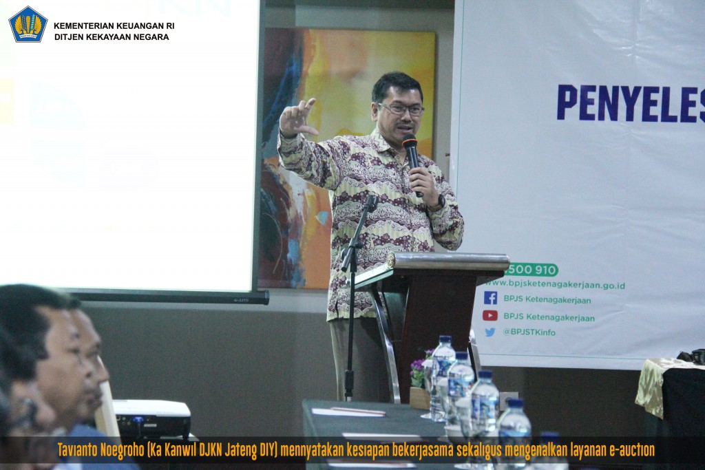 Selanjutnya Kepala Kanwil DJKN Jawa Tengah dan DI Yogyakarta, Tavianto Noegroho dalam sambutannya berharap perusahaan akan semakin taat dalam menyelesaikan kewajibannya sehingga tidak banyak piutang macet yang diserahkan, namun pada dasarnya pihaknya siap membantu menyelesaikan piutang macet yang diamanahkan. Setelah memberikan sambutan, Tavianto menjawab pertanyaan-pertanyaan dari para peserta. Kesempatan tersebut juga dimanfaatkannya untuk mengenalkan layanan lelang utamanya e-Auction.