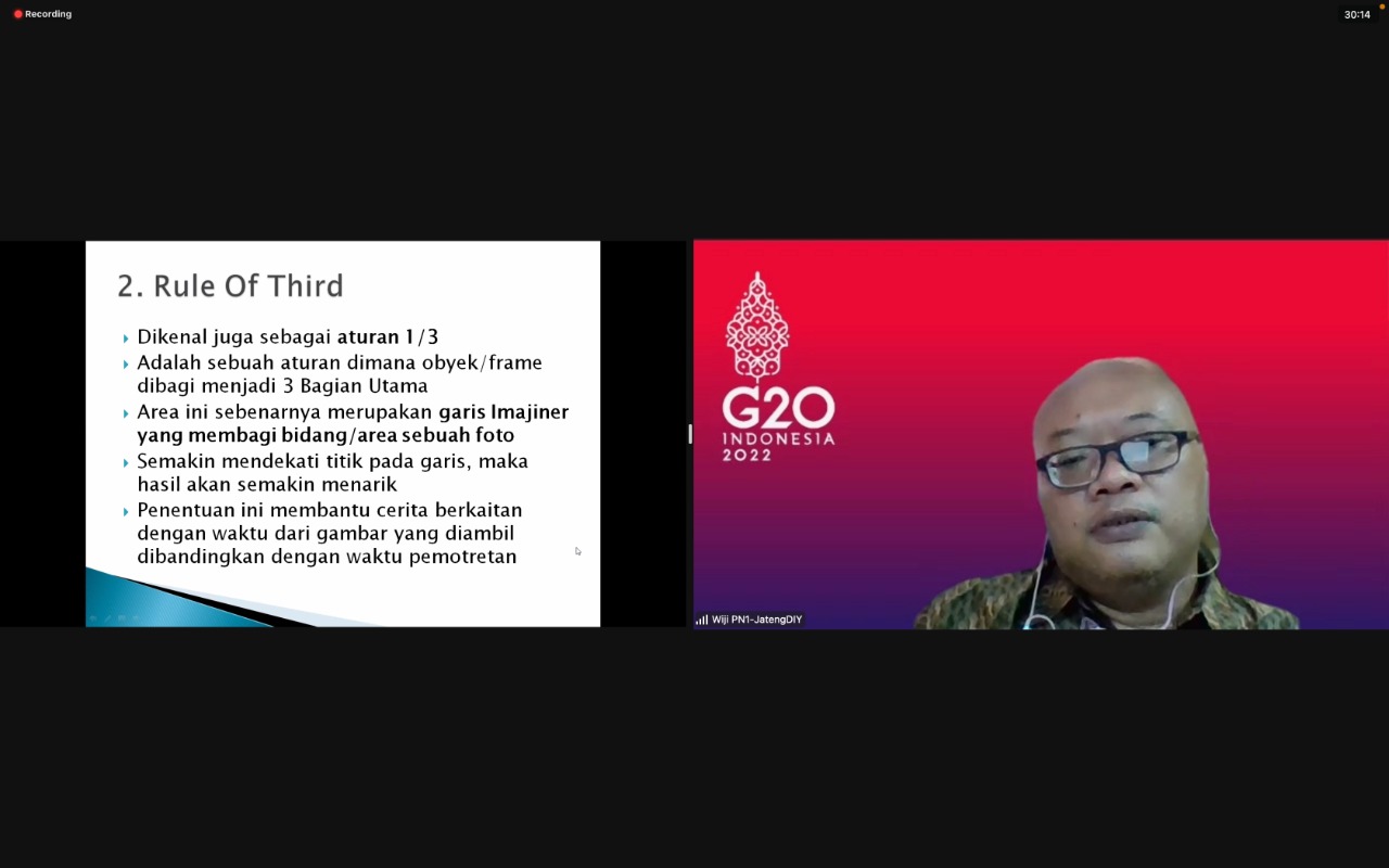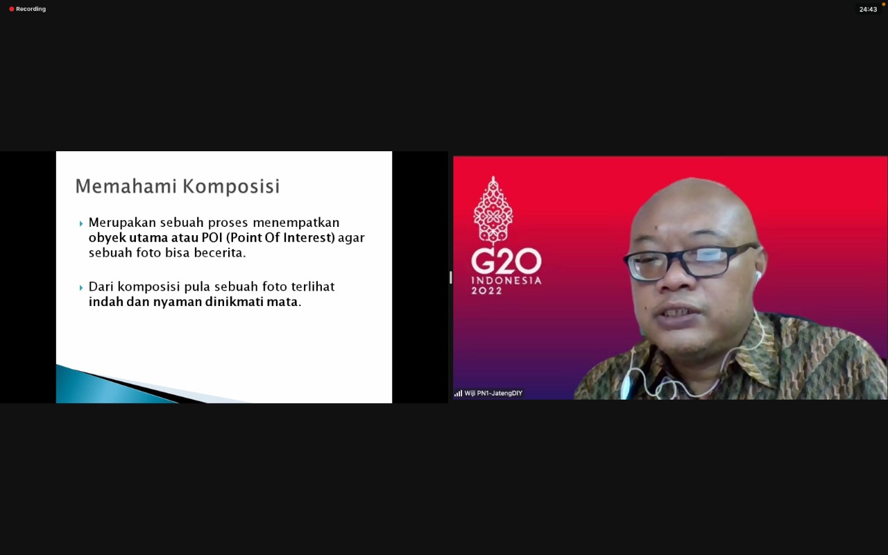 Selanjutnya, Wiji menjelasakan mengenai POI atau Point of Interest. POI merupakan titik fokus pada subjek utama foto yang membuat foto memiliki arti. POI mempermudah orang untuk memahami konteks secara keseluruhan dalam sekali pandang. Selain itu, Wiji menjelaskan mengenai aturan umum fotografi, jenis-jenis fotografi, dan menceritakan pengalamannya berkecimpung di dunia fotografi.