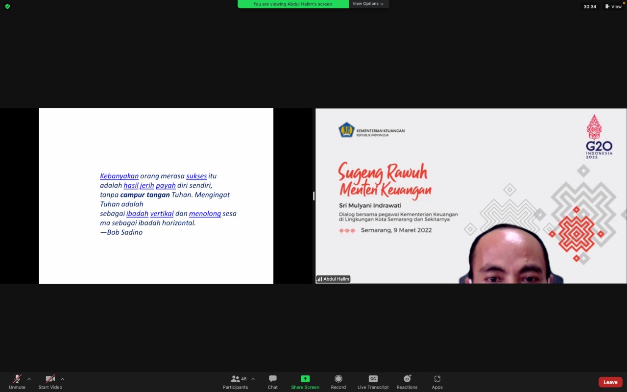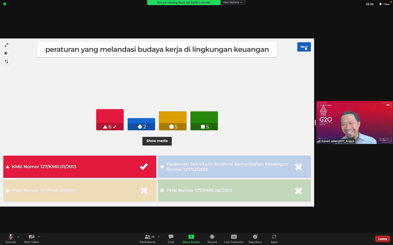 Acara Mocacino dilaksanakan melalui Zoom Meeting dan dilaksanakan setiap pekan serta salah satu tujuannya untuk menginternalisasi nilai-nilai dan budaya kerja Kementerian Keuangan.