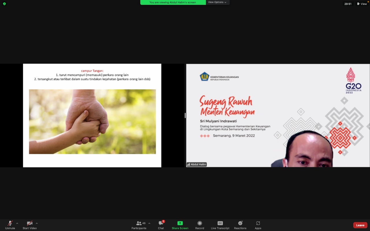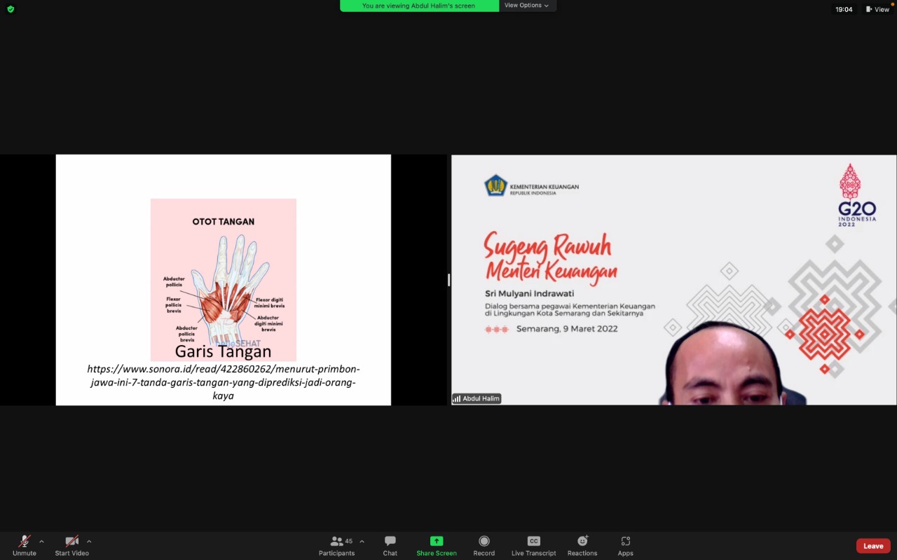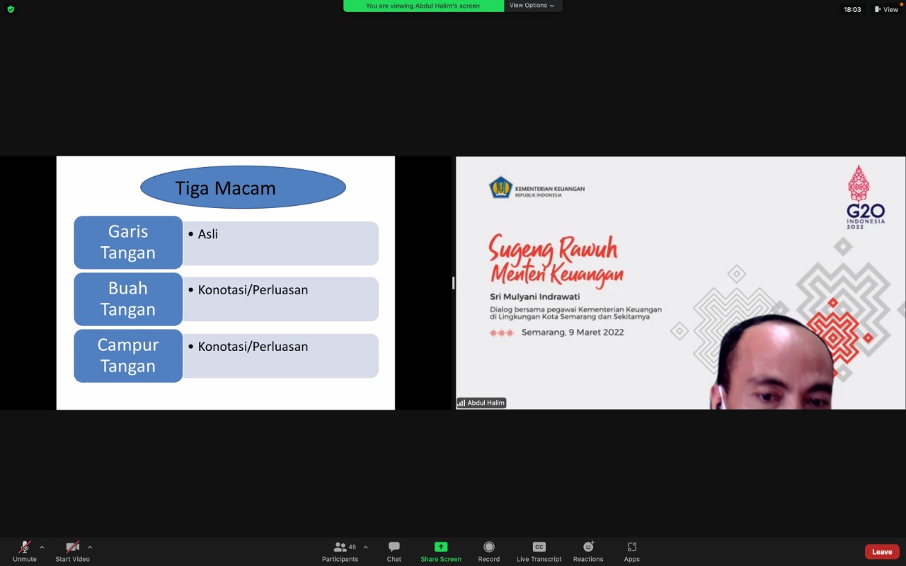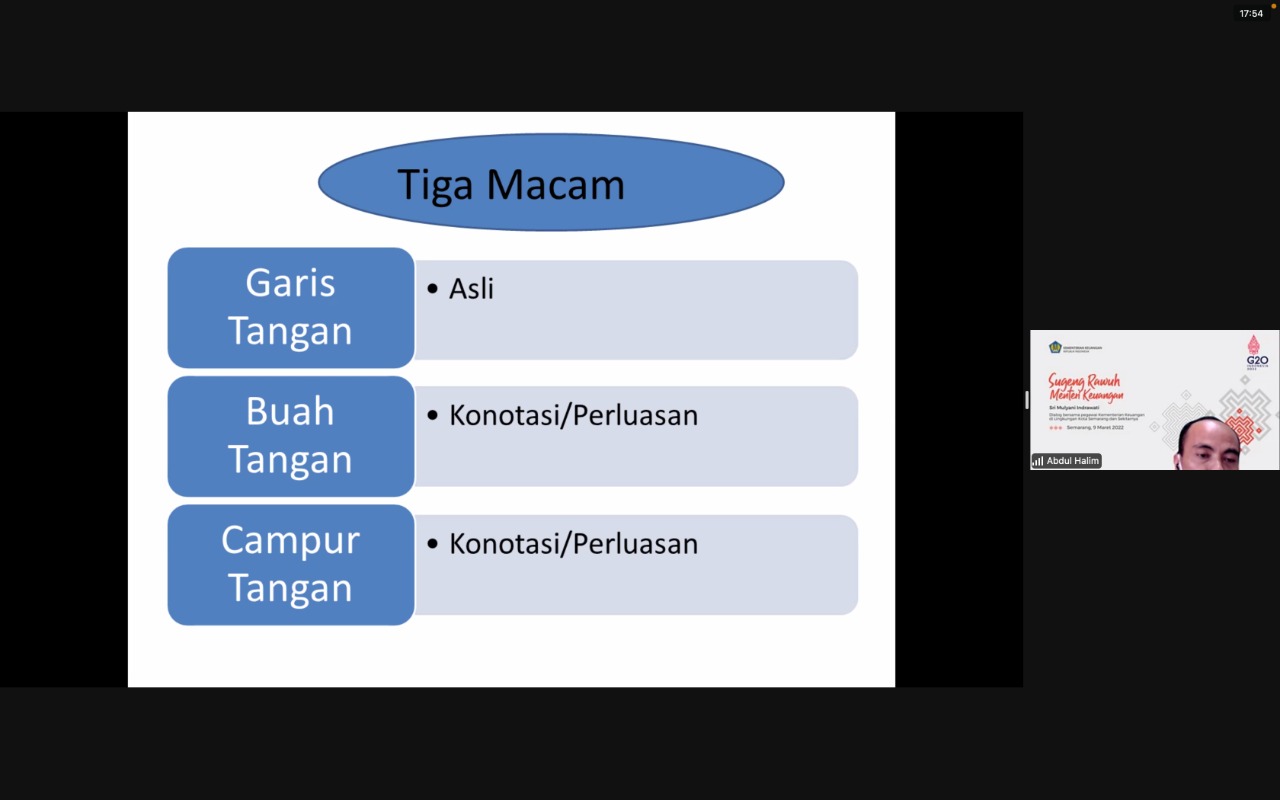 Pada Kamis (10/03) kali ini, Kepala Seksi Penilaian I, Abdul Khalim, berkesempatan untuk memaparkan materi mengenai “Tiga Tangan” dalam Kehidupan Kita. Khalim menjelaskan bahwa terdapat “Tiga Tangan”, yaitu pertama “Garis Tangan”, yang mana bermakna asli; kedua “Buah Tangan”, yang mana bermakna konotasi atau perluasan; dan ketiga “Campur Tangan”, yang bermakna konotasi atau perluasan.