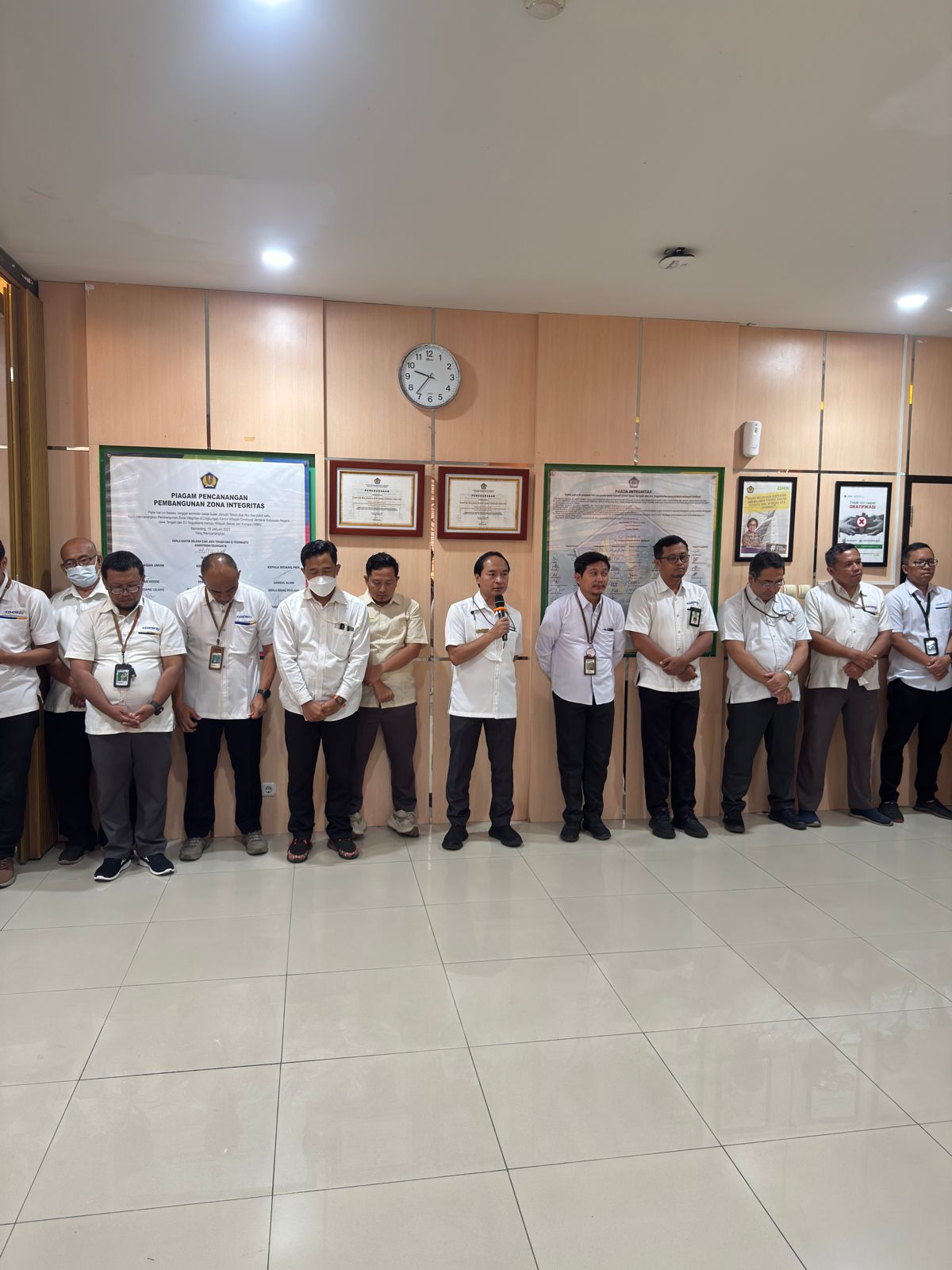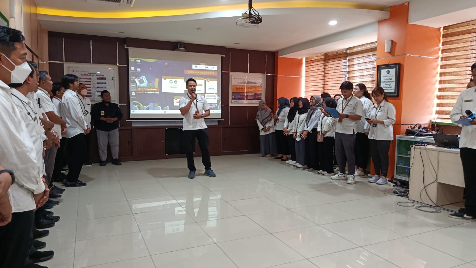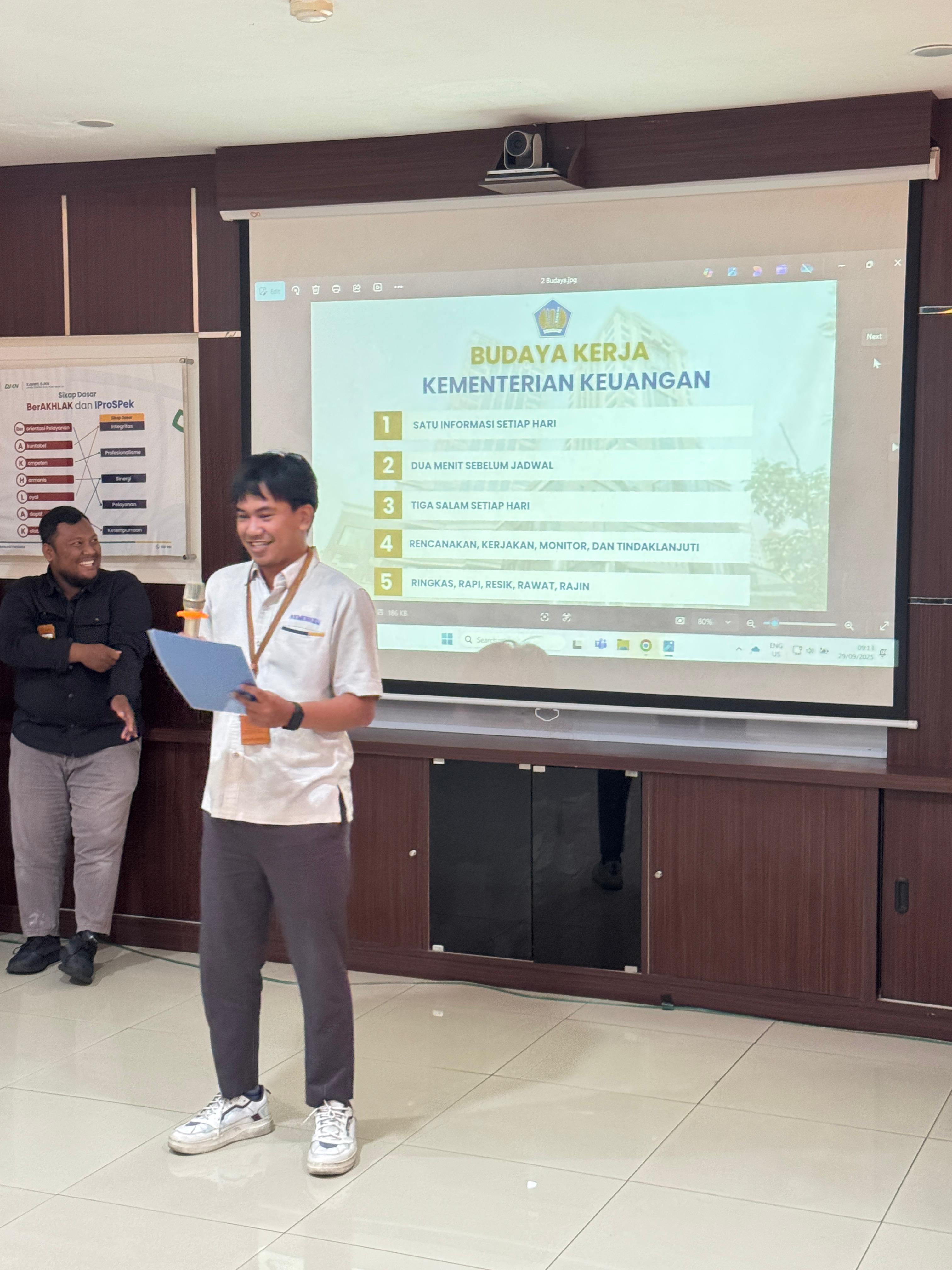 Semarang (29/09) - Mengawali pekan ke V bulan September SeSrawungan edisi ke 14 hadir kembali sebagai sarana untuk mempererat keakraban para pejabat dan pegawai dilingkungan Kanwil DJKN Jawa Tengah dan D.I. Yogyakarta. Pada edisi kali ini Anggana Bayu Aji bertugas sebagai pembawa acara. Diawali dengan Doa bersama dan dilanjutkan dengan menyanyikan lagu kebangsaan Indonesia raya dan Mars Keuangan, selanjutnya untuk membakar semangat para pegawai Gede Sindu Putra Wijaksana mengajak untuk meneriakkan yel-yel Kanwil DJKN Jawa Tengah dan D.I. Yogyakarta. Untuk memperkuat budaya organisasi guna mendorong peningkatan kinerja pegawai dalam mendukung pelaksanaan tugas dan fungsi Kementerian Keuangan, Lintang Fajar Aditama mengajak para pejabat dan pegawai untuk membacakan Nilai-nilai Kementerian Keuangan dan Budaya Kerja Kementerian Keuangan.