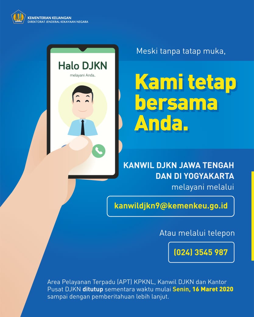 Semarang - Berdasarkan Surat Edaran Menteri Keuangan Nomor SE-5/MK.1/2020 tanggal 14 Maret 2020 tentang Panduan Tindak Lanjut Terkait Pencegahan Penyebaran Corona Virus Disease 2019 (COVID-19) di Lingkungan Kementerian Keuangan, maka dengan ini diberitahukan bahwa mulai hari Senin tanggal 16 Maret 2020 Area Pelayanan Terpadu (APT) pada Kanwil DJKN Jateng dan D.I. Yogyakarta untuk sementara ditiadakan sampai dengan pemberitahuan lebih lanjut. Meskipun layanan ditiadakan, pengguna layanan tetap diberikan pelayanan dengan melalui email kanwildjkn9@kemenkeu.go.id atau melalui telepon 024-3542272.