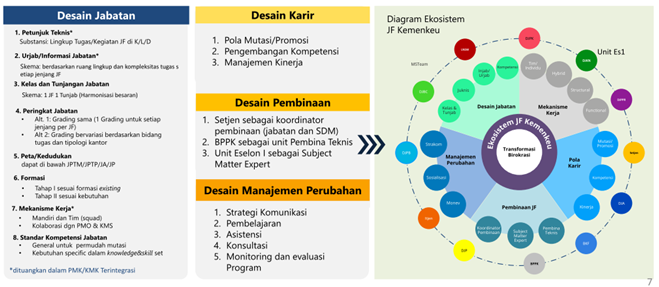 Desain ekosistem Jabatan Fungsional di Kemenkeu, akan segera diterbitkan pada Rancangan Keputusan Menteri Keuangan (RKMK) implementasi Jabatan Fungsional konsolidasi agar hak kepegawaian pejabat fungsional yang terdampak dapat terjamin sebelum infrastruktur Jabatan Fungsional konsolidasi ditetapkan. Infrastruktur Jabatan Fungsional akan diatur dalam PMK/KMK terintegrasi.