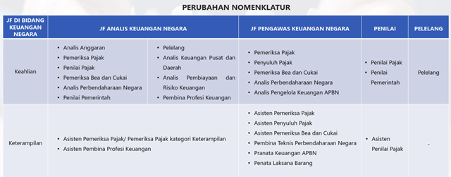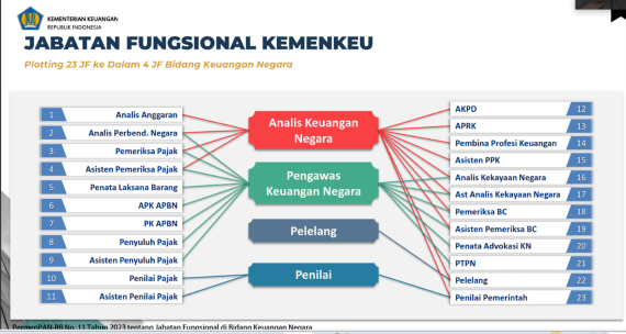 Setelah diterbitkannya Peraturan MenPAN-RB Nomor 11 Tahun 2023 Tentang JabatanFungsional di Bidang Keuangan Negara, pada Kemenkeu menjadi hanya 4 jabatan fungsional.