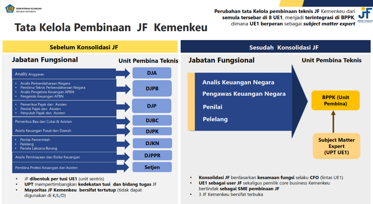 Konsolidasi jabatan fungsional di Kemenkeu yang terjadi pasca terbitnya Peraturan MenPAN-RB Nomor 11 Tahun 2023 Tentang Jabatan Fungsional di Bidang Keuangan Negara, memiliki tujuan agar jabatan di Kemenkeu lebih general dan kaya akan fungsi dengan pola karir yang lebih terbuka, organisasi yang agile, dan pengelolaan Sumber Daya Manusia (SDM) yang efisien.