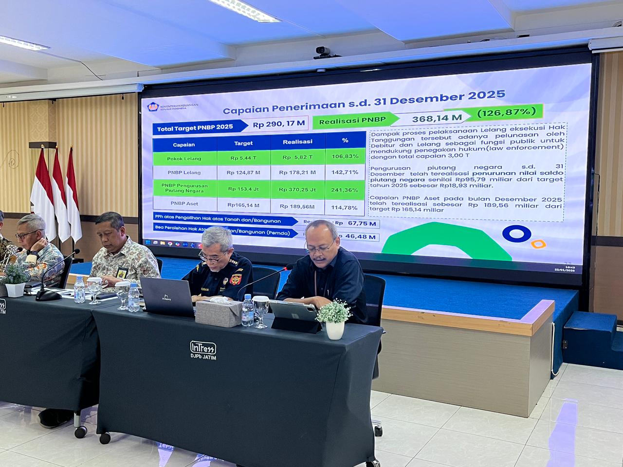Sementara itu, pertumbuhan realisasi Penerimaan Negara Bukan Pajak (PNBP) didorong oleh peningkatan realisasi PNBP Badan Layanan Umum (BLU) dan PNBP dari pengelolaan aset. Capaian tersebut mencerminkan kualitas layanan pemerintah dan tata kelola keuangan yang semakin baik. Dari pengelolaan aset, realisasi lelang, PNBP Pengelolaan BMN dan piutang negara s.d. 31 Desember 2025 yang dilaksanakan DJKN, Realisasi pokok lelang Kanwil DJKN Jatim mencapai Rp5,82 triliun atau 106,83 persen dari target Rp 5,44 triliun, PNBP Lelang sebesar Rp178,21 miliar atau 142,71 persen dari target Rp124,87 miliar, PNBP Pengurusan Piutang Negara Rp370,25 juta atau 241,36 persen dari target Rp153,4 juta dan PNBP Aset Rp189,56 miliar atau 114,78 persen dari target Rp165,14 miliar.