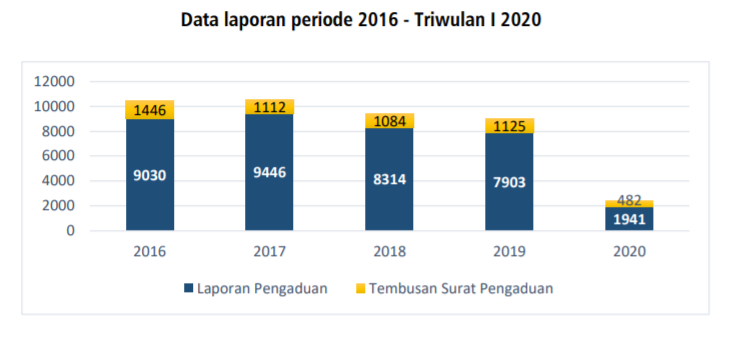 Berdasarkan grafik yang dipublikasi oleh Obdusman, dapat dilihat bahwa laporan masyarakat mengalami sedikit penurunan dengan instansi terlapor paling banyak pemerintah daerah, K/L dan kepolisian.