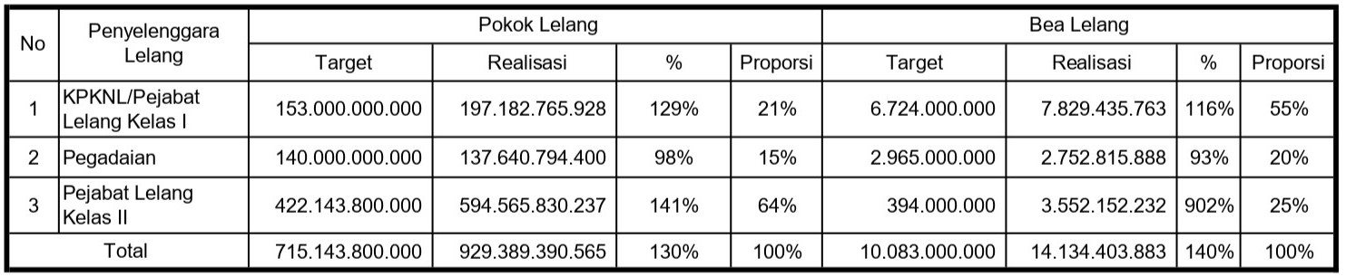 Dari tabel di atas, capaian pokok lelang Pejabat Lelang Kelas II berkontribusi sebesar 64% dari total capaian, diikuti KPKNL/Pejabat Pejabat Lelang Kelas I sebesar 21% dan Pegadaian 15%. Sementara itu, capaian Bea Lelang, KPKNL/Pejabat Lelang Kelas I berkontribusi sebesar 55% dari total capaian, diikuti Pejabat Lelang Kelas II sebesar 25% dan Pegadaian 20%. Persentase kontribusi capaian Pokok Lelang dan PNBP tidak linier karena adanya perbedaan tarif pengenaan Bea Lelang. Tarif Bea Lelang lelang sukarela Pejabat Lelang Kelas II lebih kecil dibandingkan tarif pada Pegadaian dan KPKNL/Pejabat Lelang Kelas I.