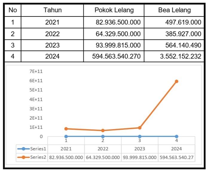 Hasil lelang yang dicapai oleh ketiga penyelenggara lelang dimaksud di tahun 2024 adalah sebesar Rp929.389.390.565,- (Sembilan Ratus Dua Puluh Sembilan Milyar Tiga Ratus Delapan Puluh Sembilan Juta Tiga Ratus Sembilan Puluh Ribu Lima Ratus Enam Puluh Lima Rupiah) dan Penerimaan Negara Bukan Pajak (PNBP) berupa Bea Lelang sebesar Rp14.234.403.883,- (Empat Belas Milyar Dua Ratus Tiga Puluh Empat Juta Empat Ratus Tiga Ribu Delapan Ratus Delapan Puluh Tiga Rupiah), dengan rincian sebagai berikut: