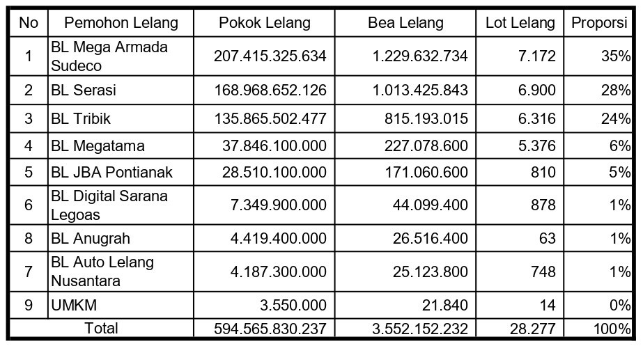 Pejabat Lelang Kelas II Kalimantan Barat telah melelang sebanyak 28.277 objek