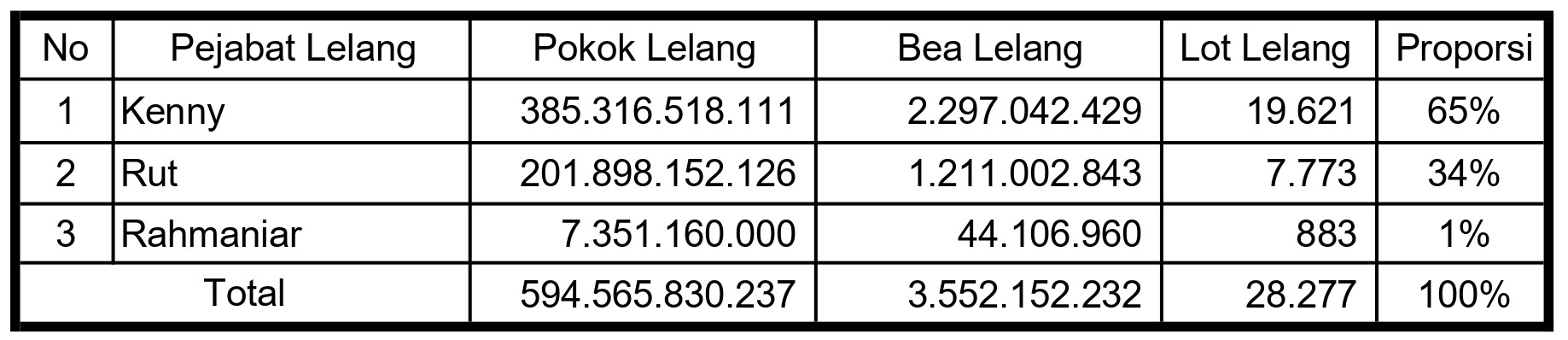 terdapat 3 (tiga) orang Pejabat Lelang Kelas II, yakni Kenny dan Rahmaniar yang berkedudukan